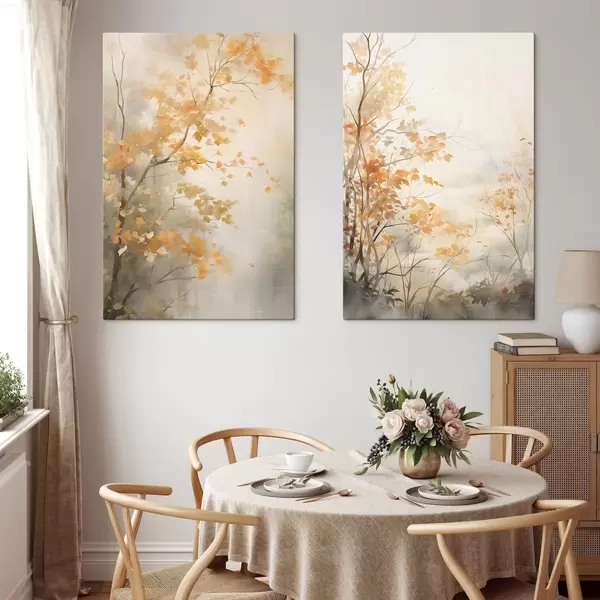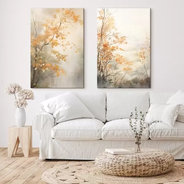 Obraz Podzimní stromy s oranžovými listy a větvemi, jemný akvarelový styl, delikátní tahy štětcem Č. m00826