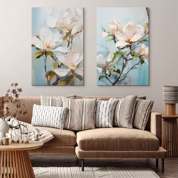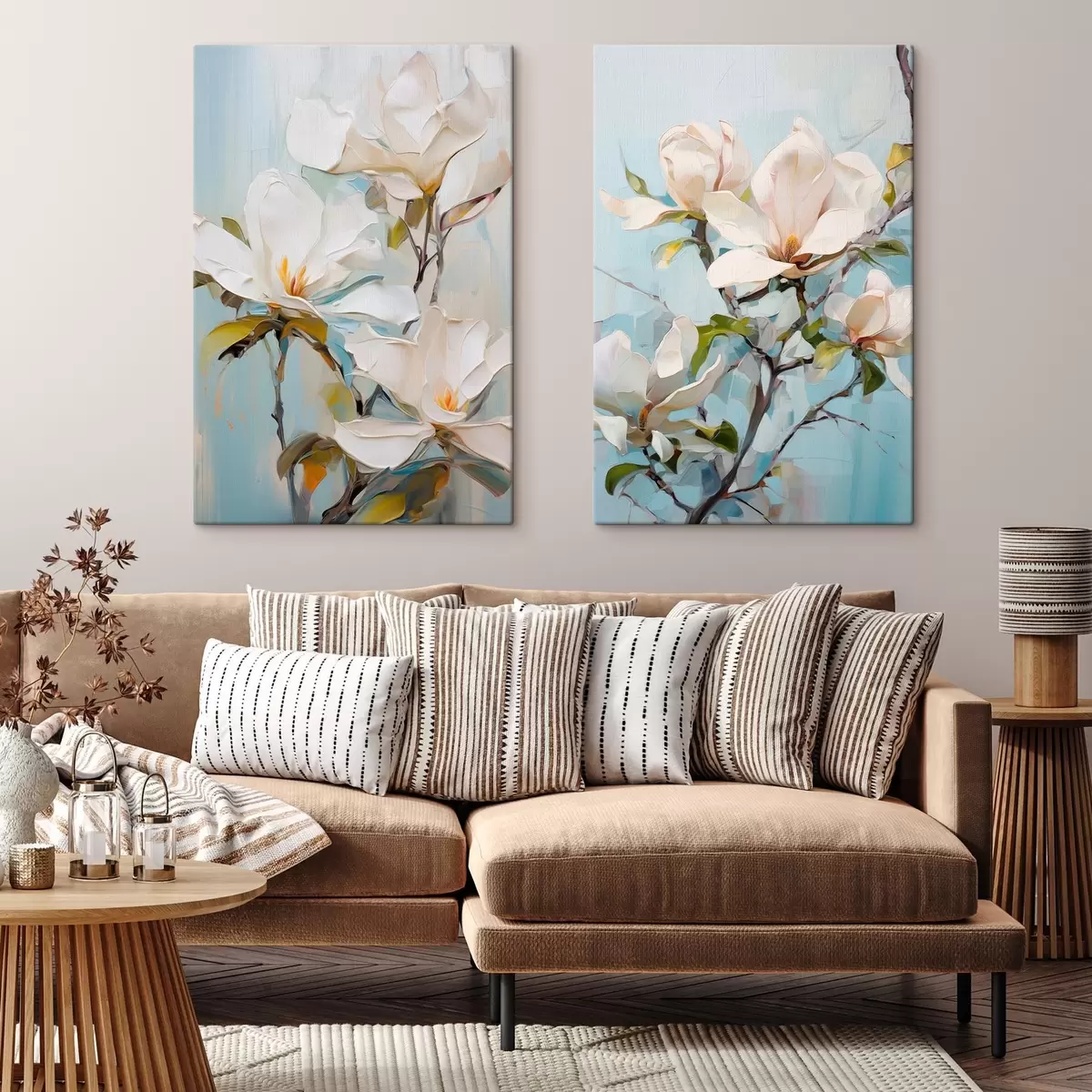 Obraz Bílé květy magnólie, světle modré pozadí s jemnými tahy štětcem, styl olejomalby, impasto textura Č. m00881