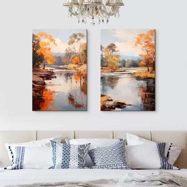 Obraz Podzimní krajina, řeka s stromy na břehu, les v pozadí, odrazy na vodě Č. m00883