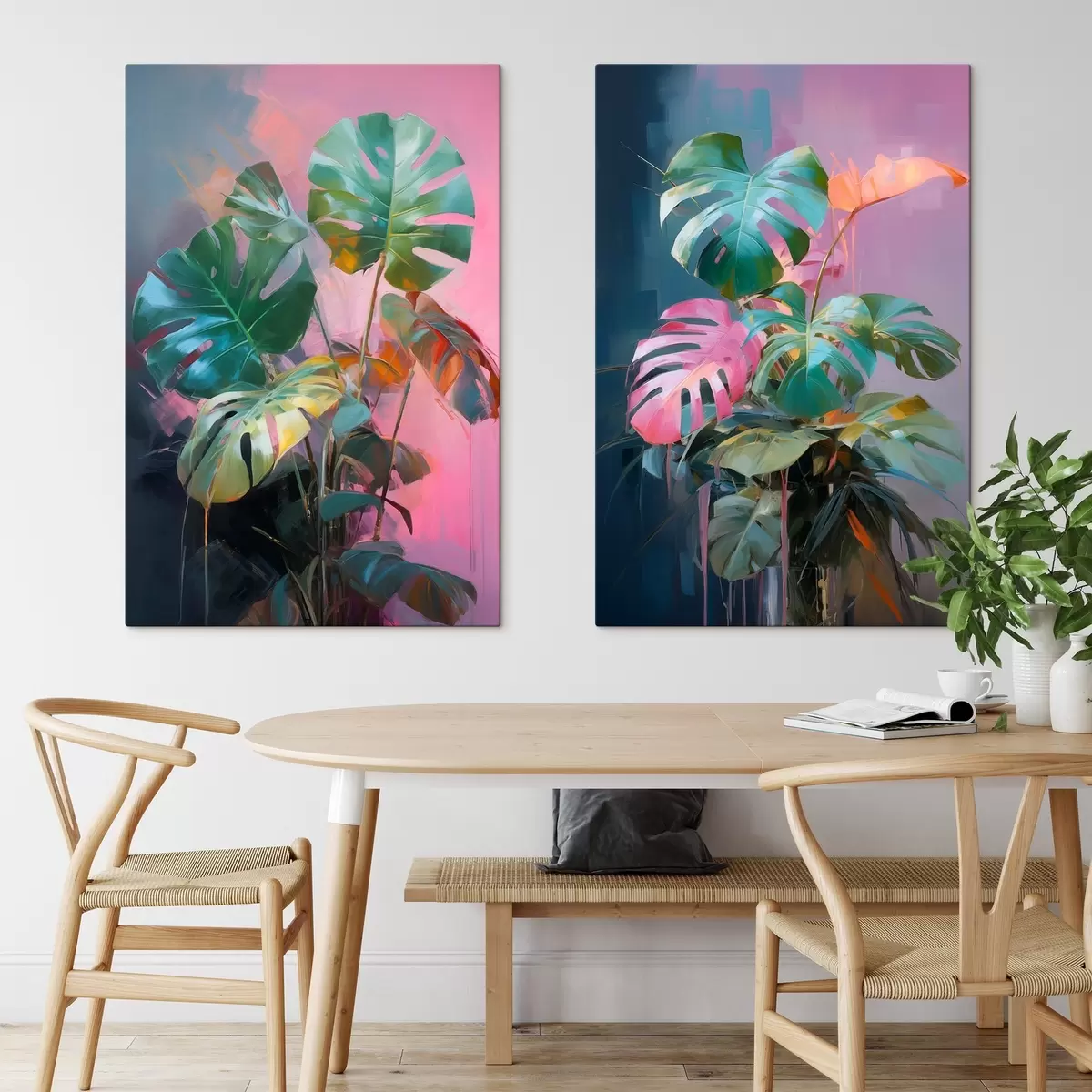 Obraz Abstraktní rostlina monstera s jasně zelenými listy na pozadí jemných růžových a fialových odstínů Č. m00886