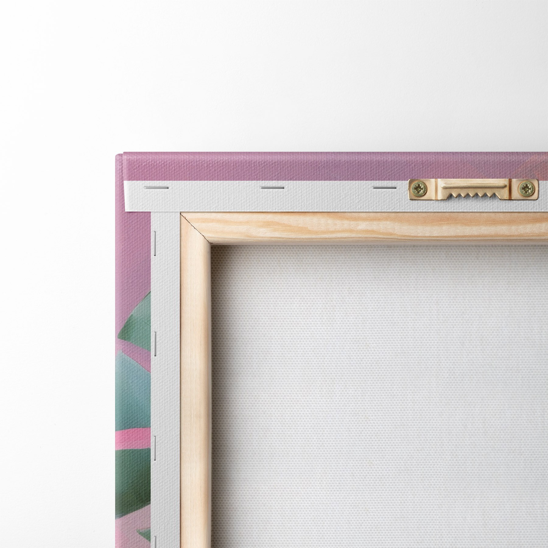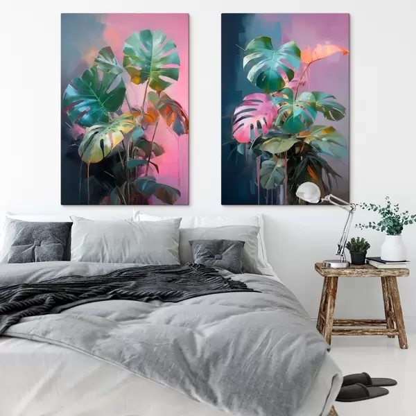 Obraz Abstraktní rostlina monstera s jasně zelenými listy na pozadí jemných růžových a fialových odstínů Č. m00886