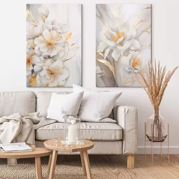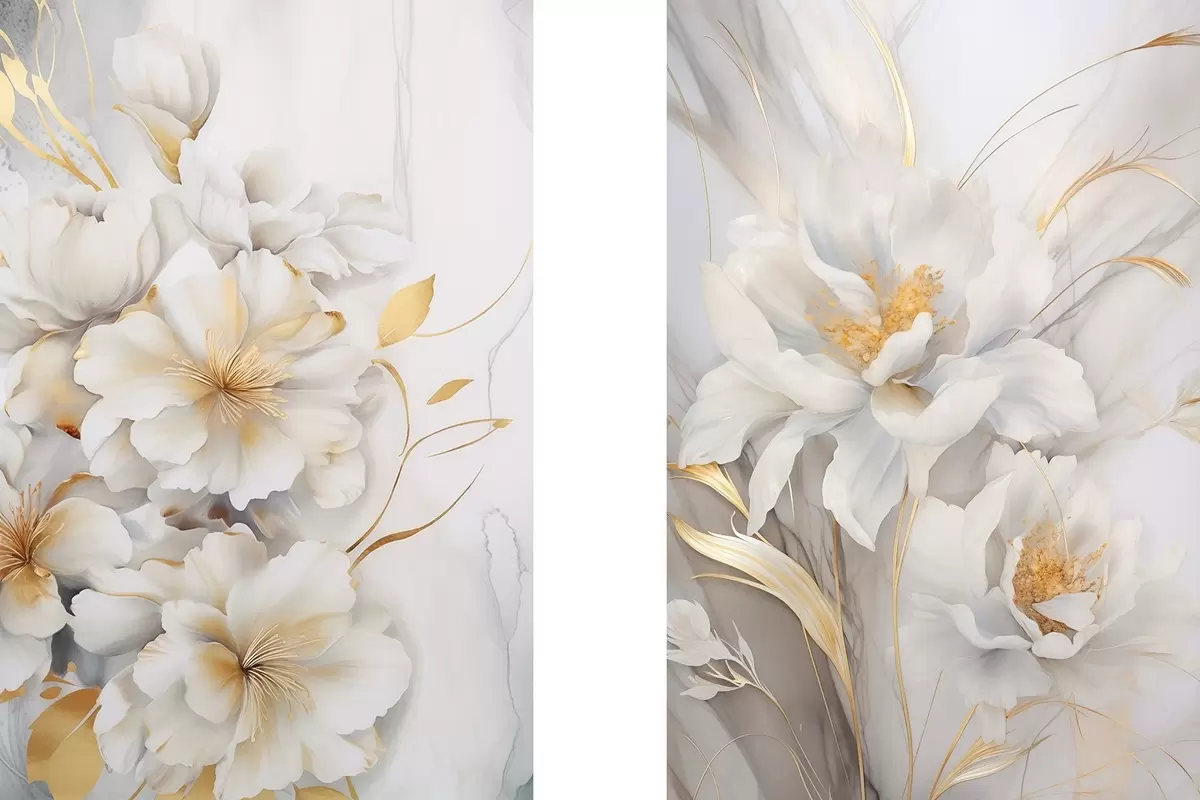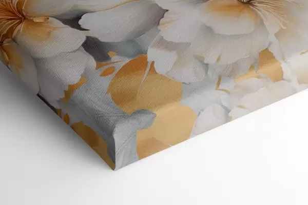 Obraz Bílé květy se žlutými detaily, okvětní lístky s jemnými stíny, světlé pozadí s jemným mramorovým efektem Č. m00889