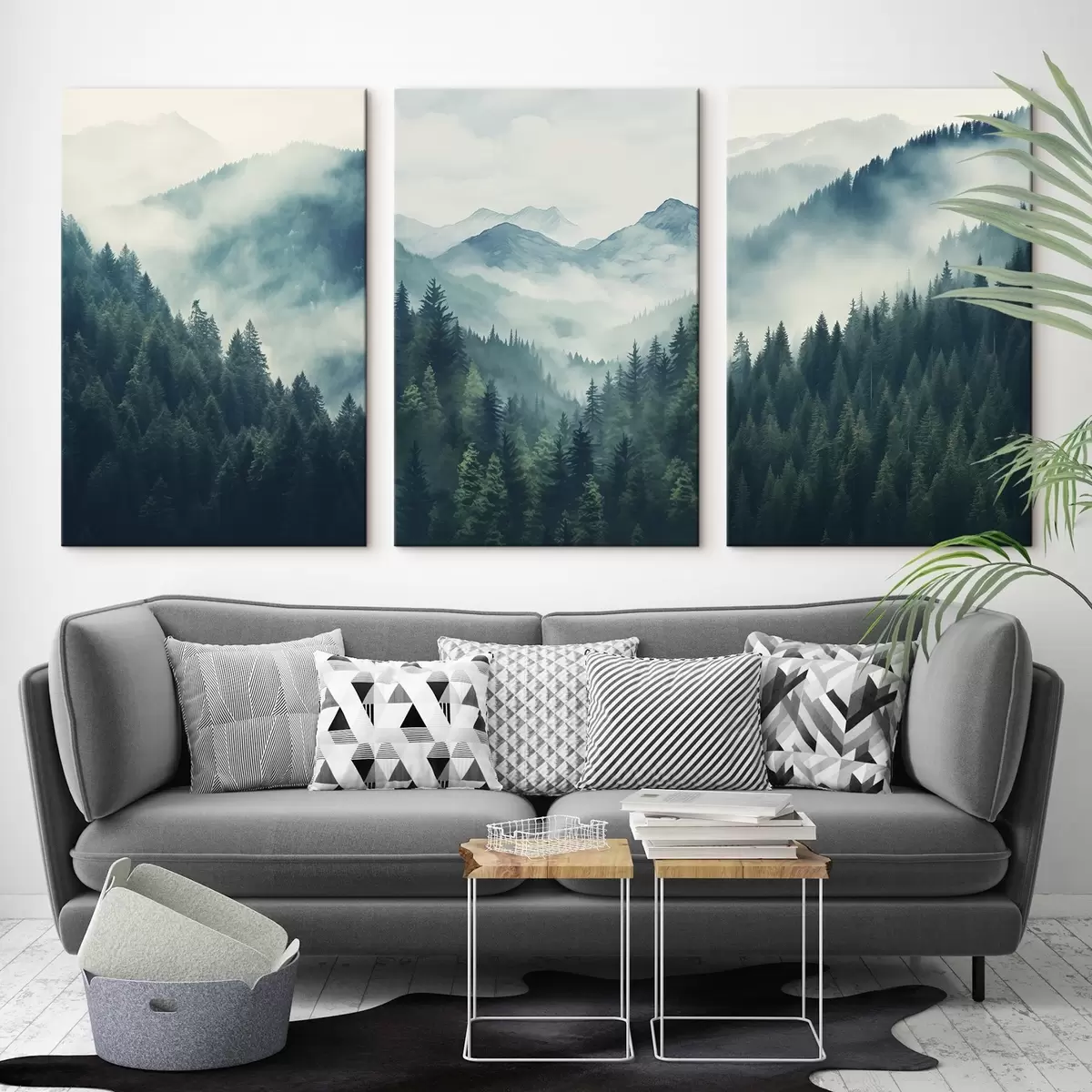 Obraz Zamlžené borovicové hory pokryté jemnými odstíny zelené a modré barvy Č. m00964