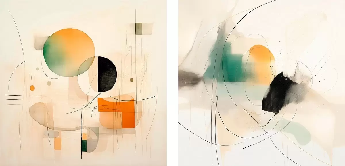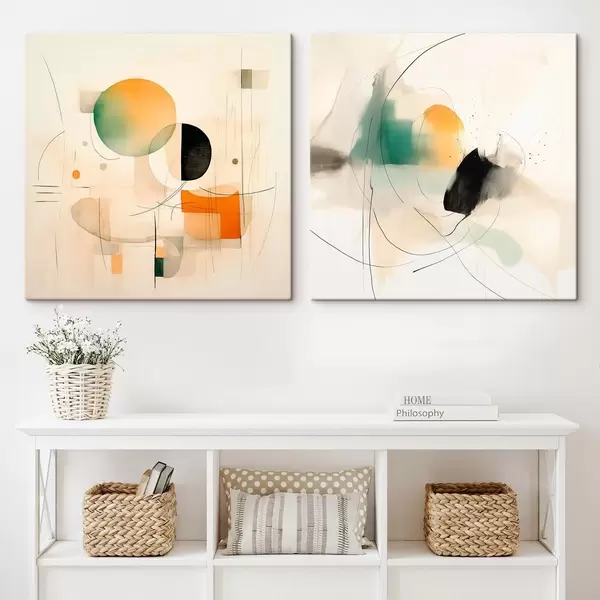Obraz Abstraktní diptych s kruhovými tvary a dynamickými liniemi Č. m00981