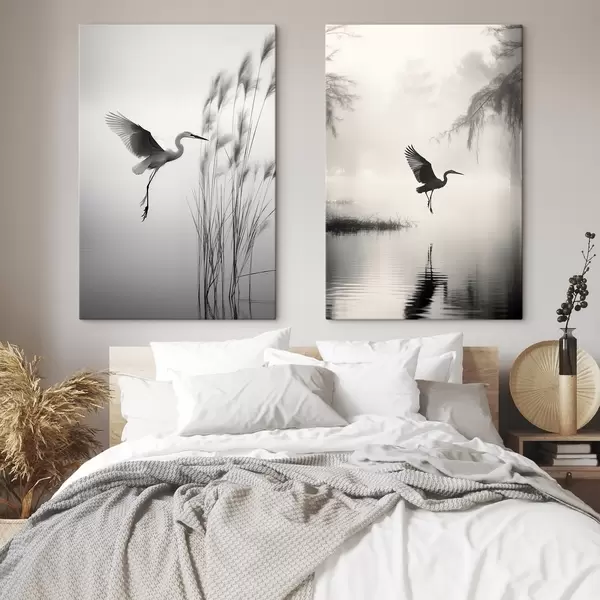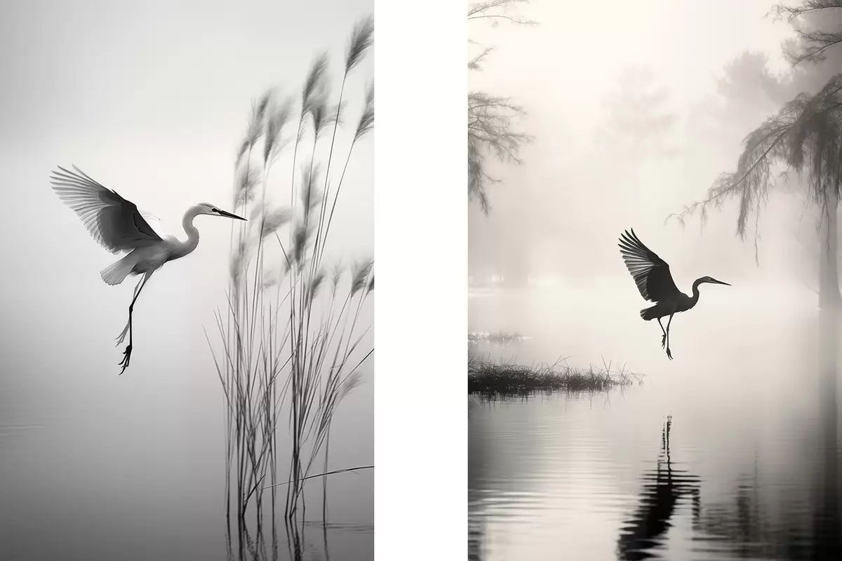 Obraz Bílá volavka s roztaženými křídly, letící poblíž vysokého rákosí, černobílá minimalistická kompozice Č. m01007