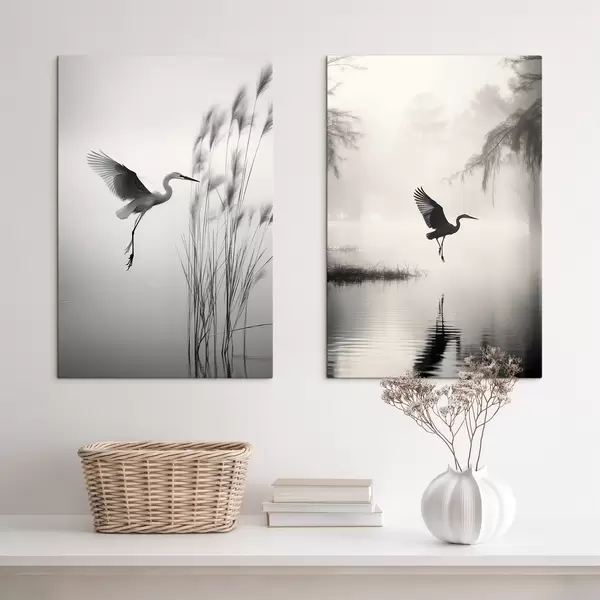Obraz Bílá volavka s roztaženými křídly, letící poblíž vysokého rákosí, černobílá minimalistická kompozice Č. m01007