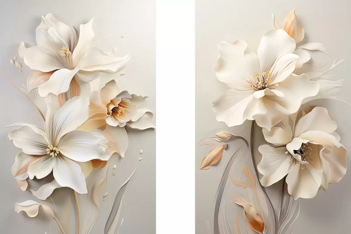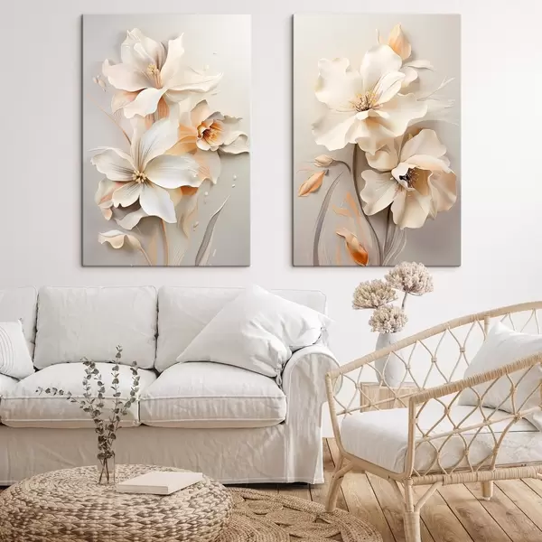 Obraz Bílé květy, okvětní lístky s jemnými stíny, světle béžové pozadí, elegantní kompozice, minimalistický styl Č. m01010