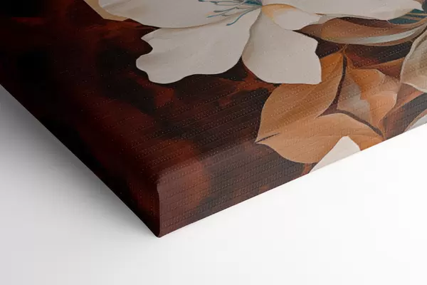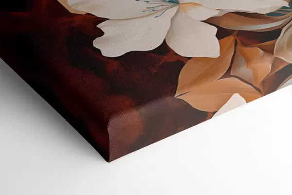 Obraz Abstraktní bílé květy a listy na hnědém a modrém pozadí s abstraktními tvary, v minimalistickém stylu Č. m01015
