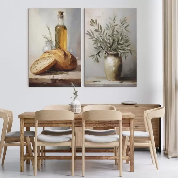 Obraz Olivové větve ve váze, chléb a láhev oleje, imitace malby Č. m01035