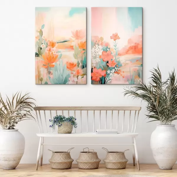 Obraz Květinové motivy v pastelových tónech na pozadí lehce zamlženého údolí Č. m01085