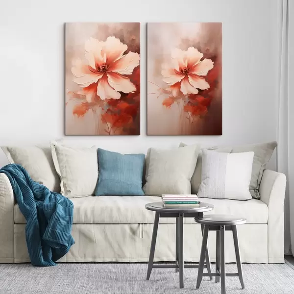 Obraz Květinová kompozice: bílé a krémové okvětní lístky, korálové akcenty a jemné zamlžené pozadí Č. m01088