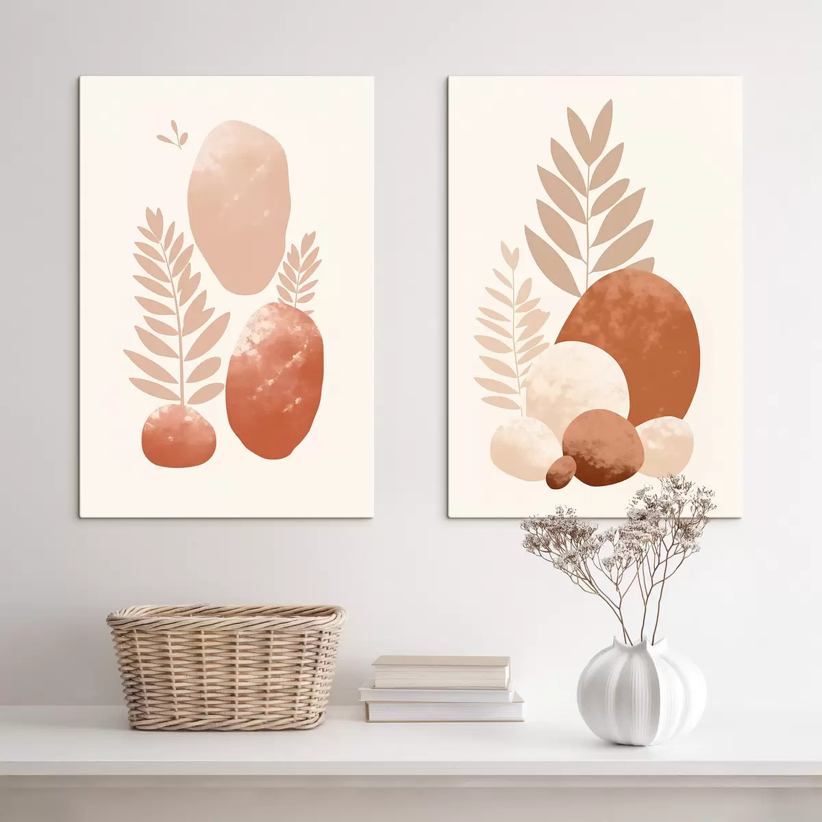 Obraz Abstraktní tvary, texturované kameny a listy v tlumených broskvových a terakotových tónech, minimalistické, krémové pozadí Č. m01114