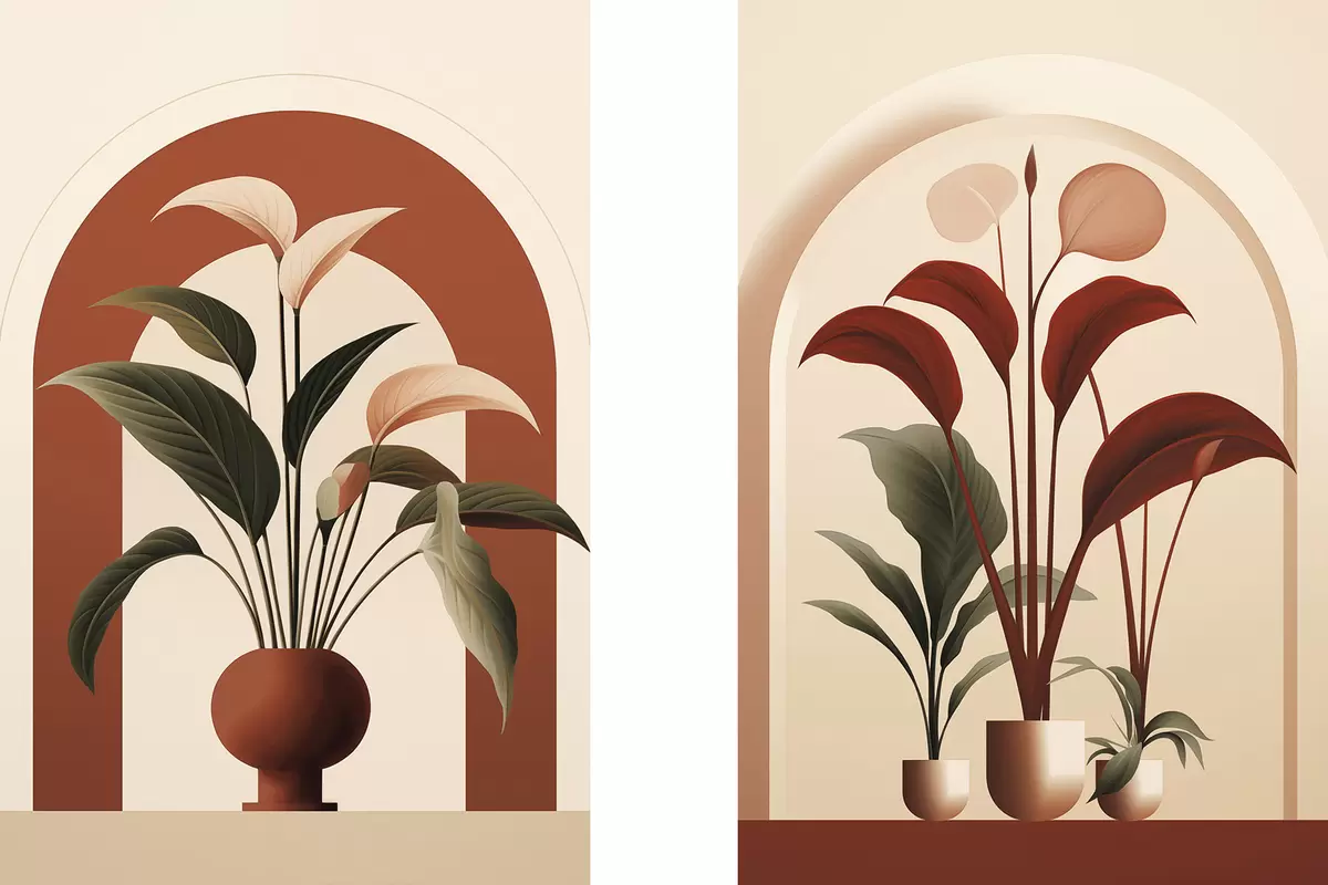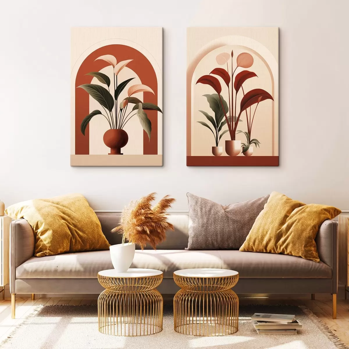 Obraz Abstraktní rostliny v květináčích s velkými zelenými a červenými listy před krémově zbarveným obloukem Č. m01124