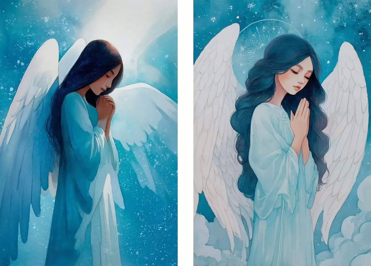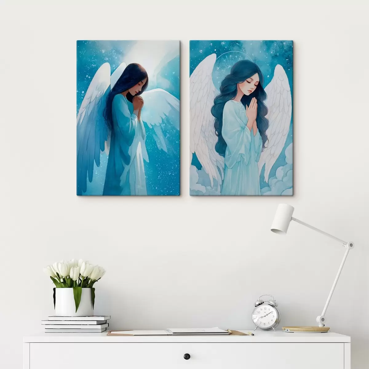Obraz Moderní sakrální umění v akvarelovém stylu s vyobrazením anděla strážného v modrém rouchu Č. m01153