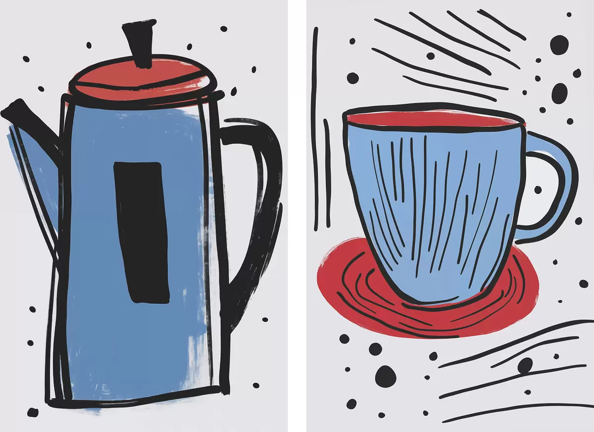 Obraz Kávová konvice a šálek napodobující primitivní kresbu Č. m01225
