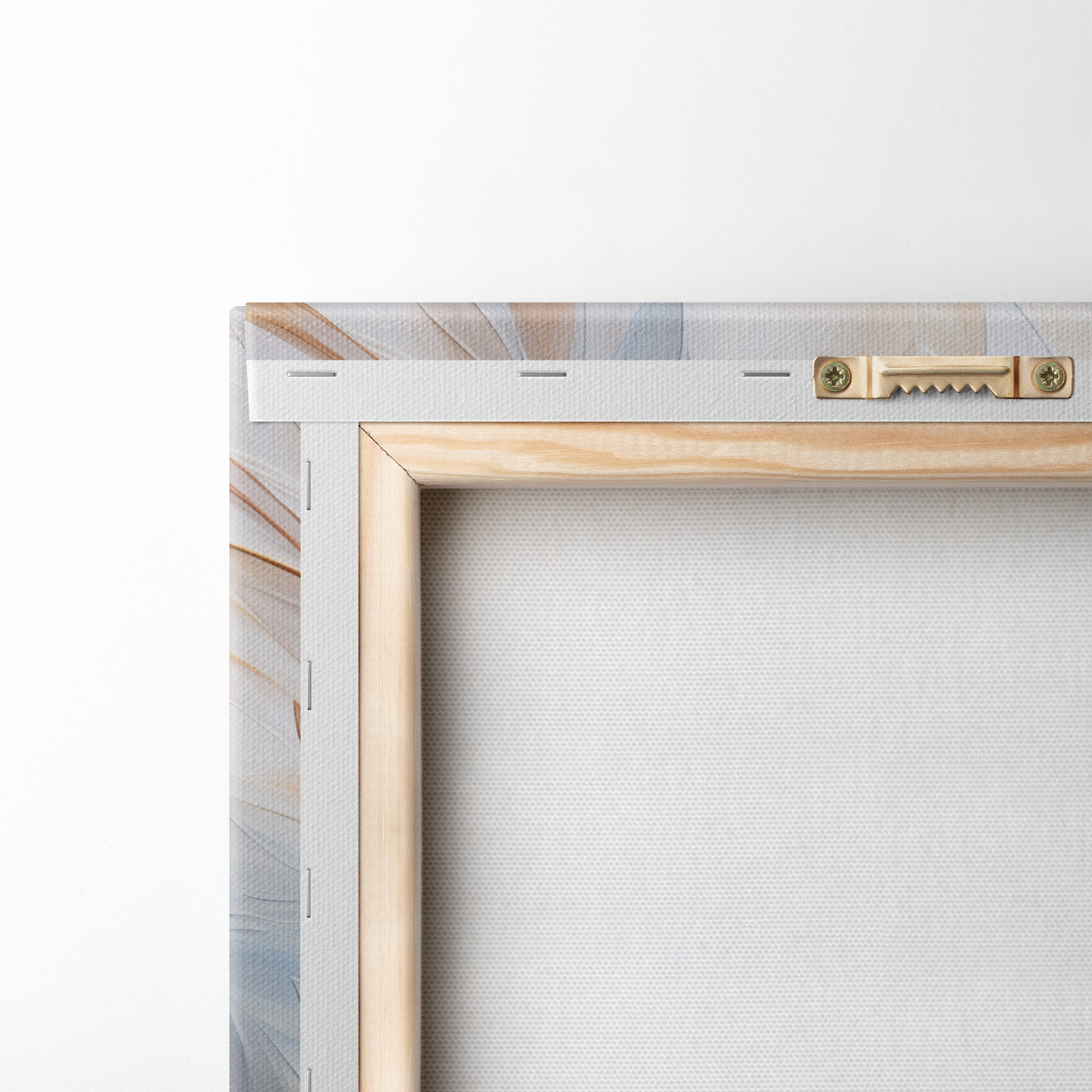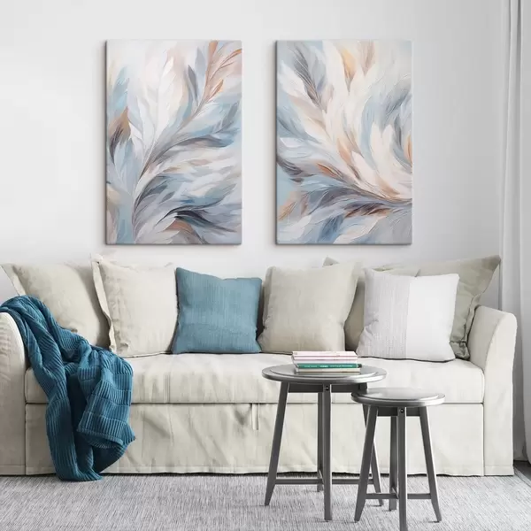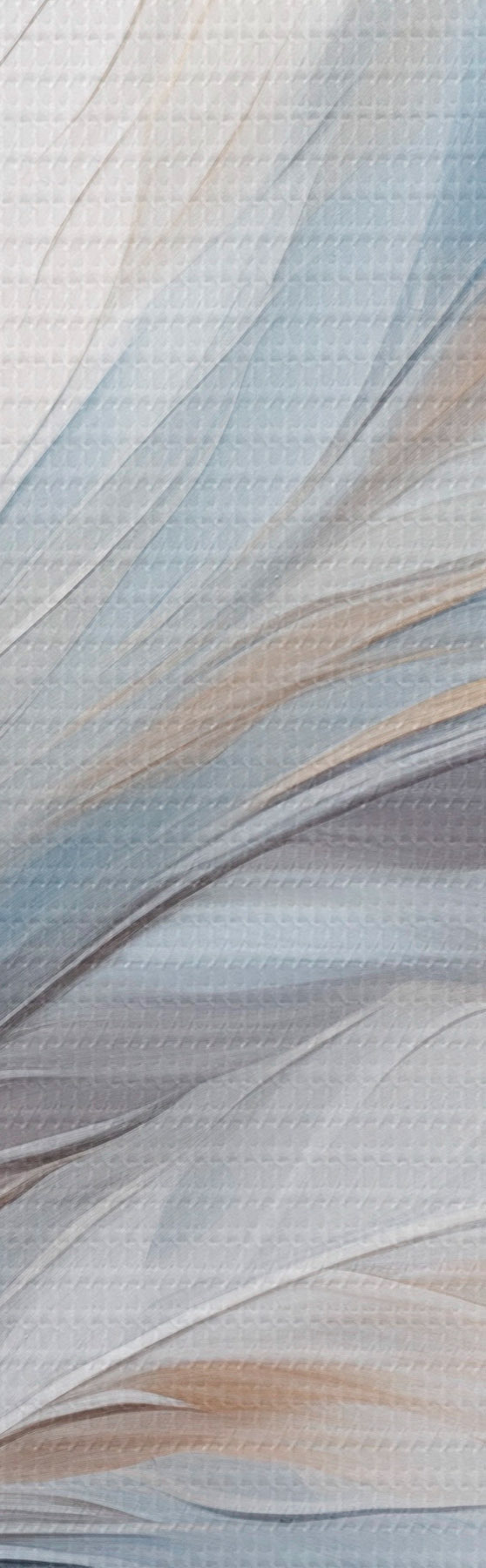 Obraz Abstraktní malba peří v odstínech bílé, modré a hnědé barvy, s jemnou, plynulou texturou a světlým pozadím. Č. m01234