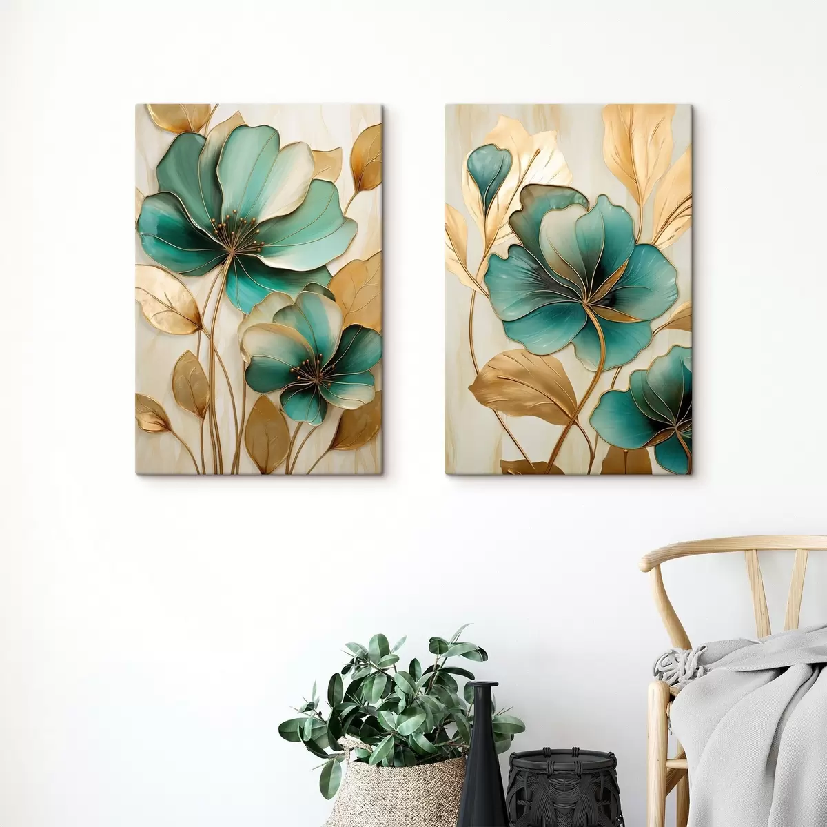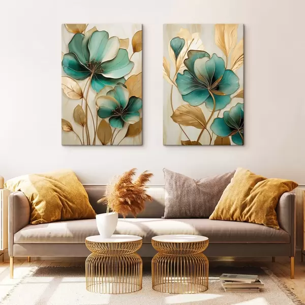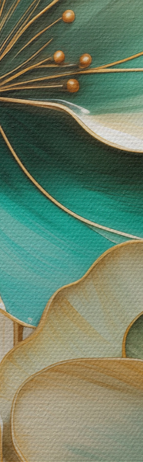 Obraz Velké modrozelené a žluté květy s obrysy, obklopené žlutými listy na abstraktním pozadí Č. m01235