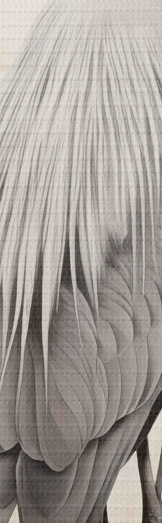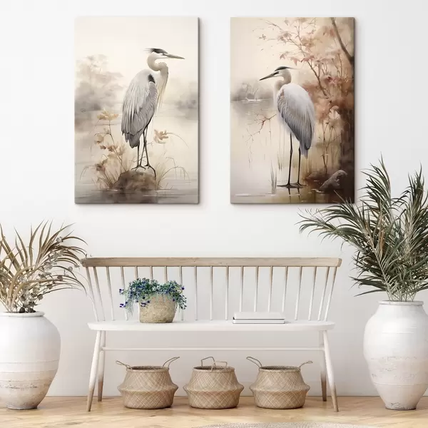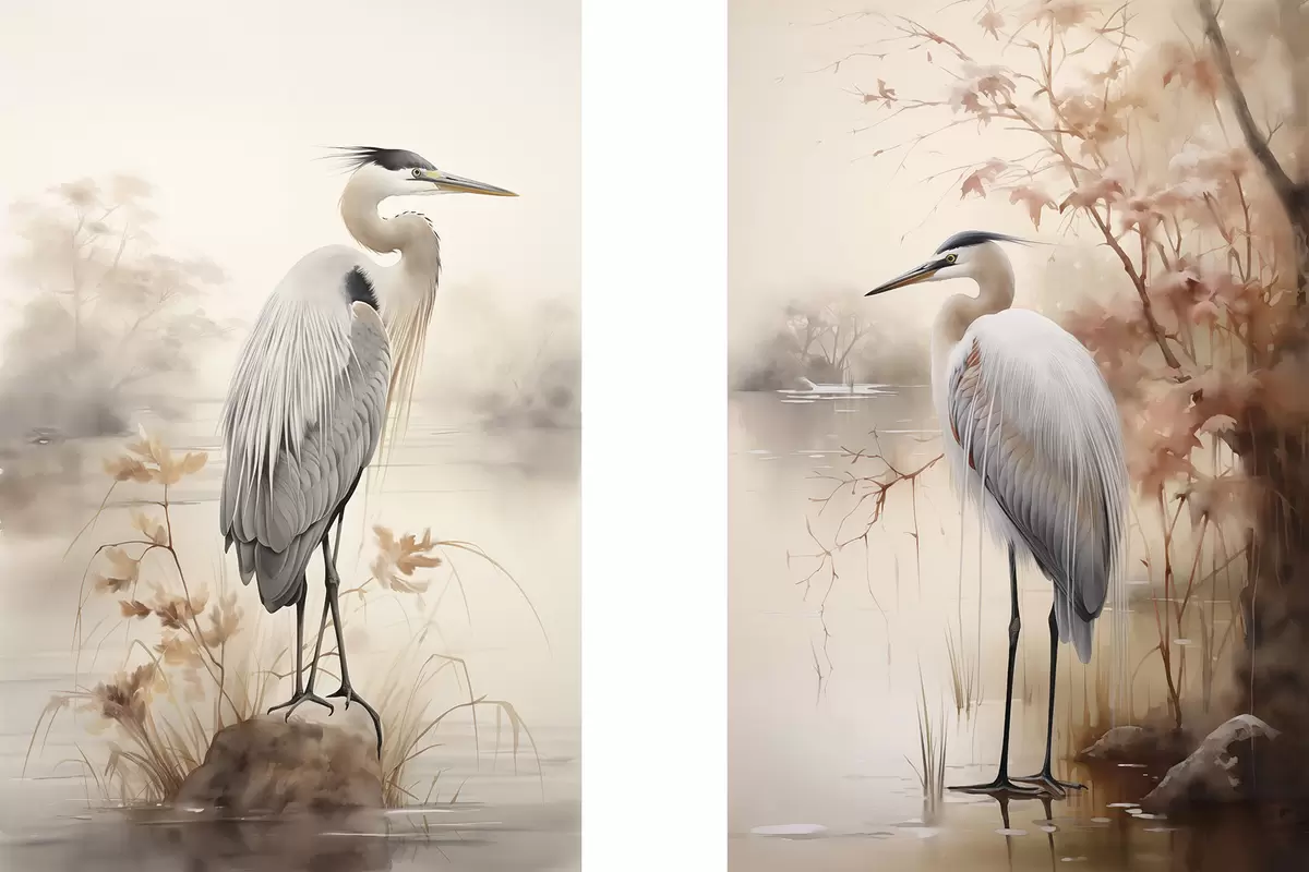 Obraz Volavka stojí na skále v jezeře s vysokými travami a stromy v pozadí. Č. m01239