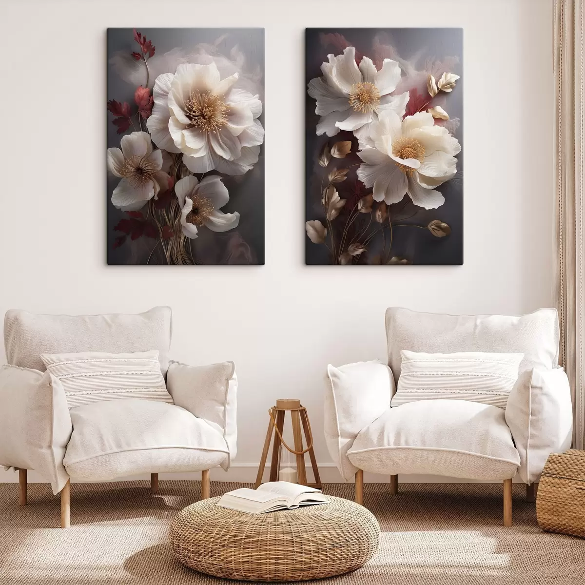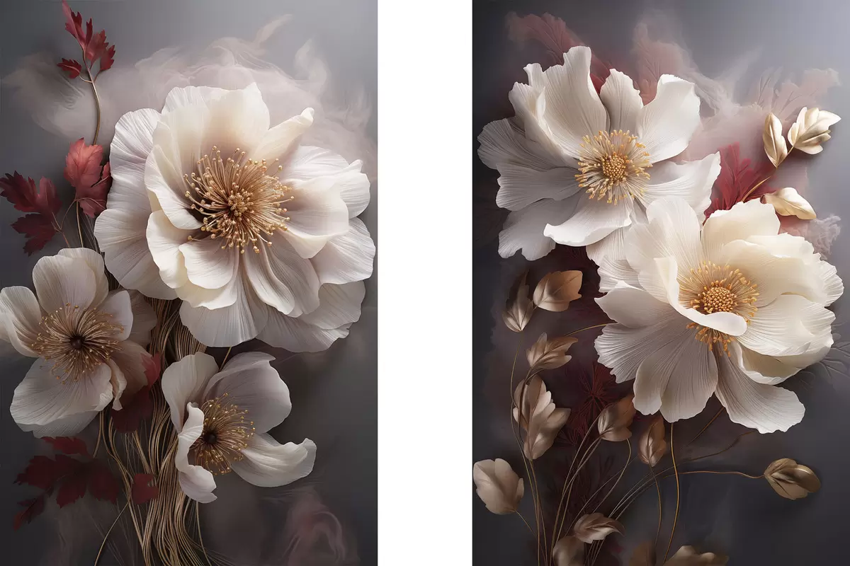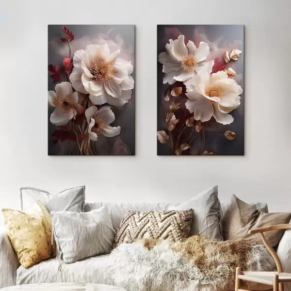 Obraz Jemné pivoňky s tenkými, jemnými okvětními lístky, obklopené tmavě červenými a žlutými listy na abstraktním pozadí Č. m01243