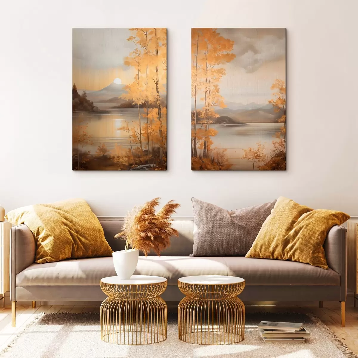 Obraz Podzimní stromy s oranžovými listy rámují klidné jezero s vzdálenými horami pod zamračenou oblohou. Č. m01246