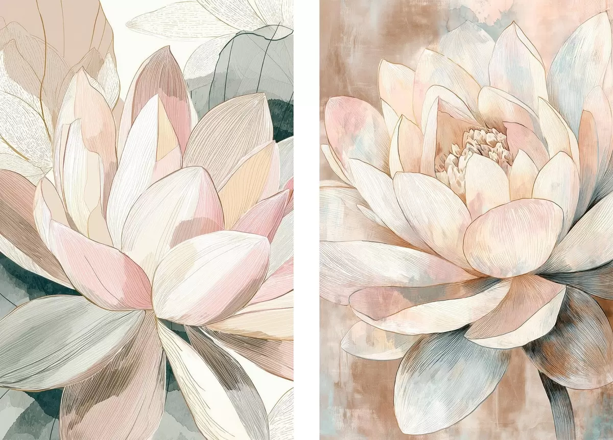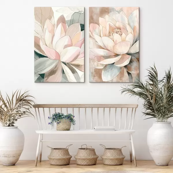 Obraz Květinová kompozice s velkými lotosy v pastelově korálové barevné paletě Č. m30034