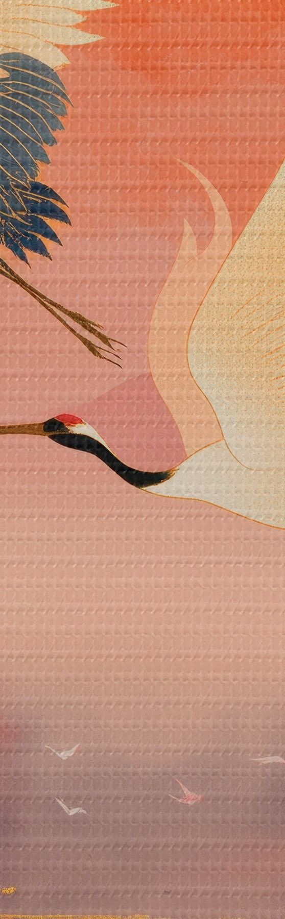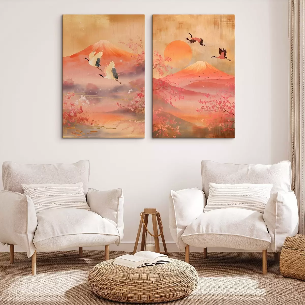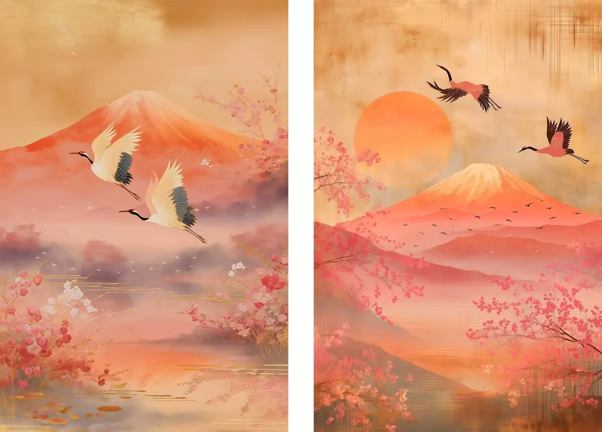 Obraz Japonská krajina s jeřáby a horou Fuji v klasickém ilustračním stylu Č. m30042