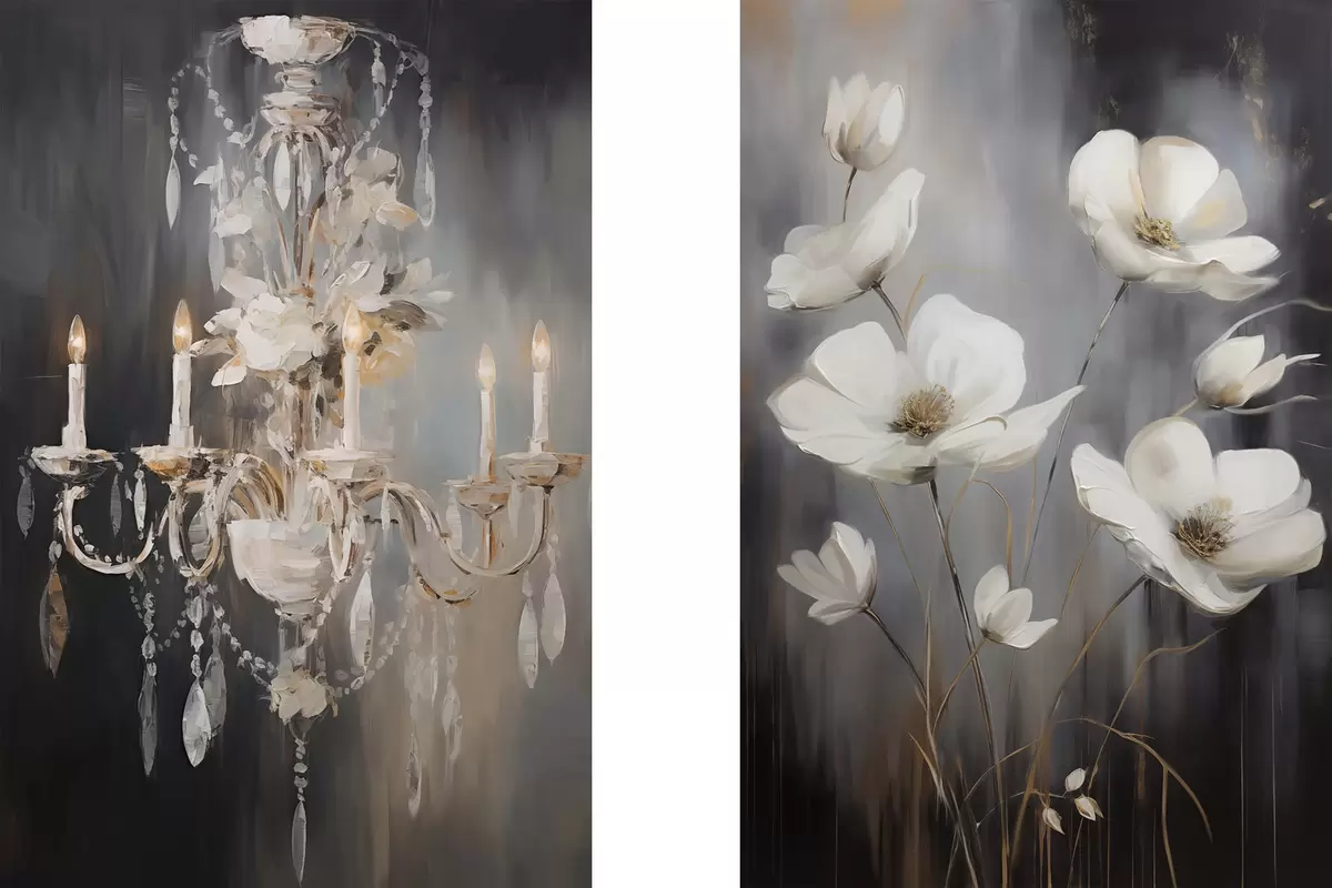 Obraz Abstraktní zdobený lustr se zapálenými svíčkami a květinovým motivem na tmavém, strukturovaném pozadí Č. m30049