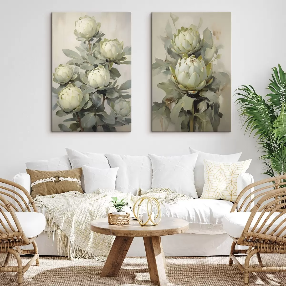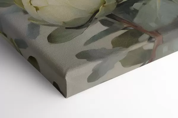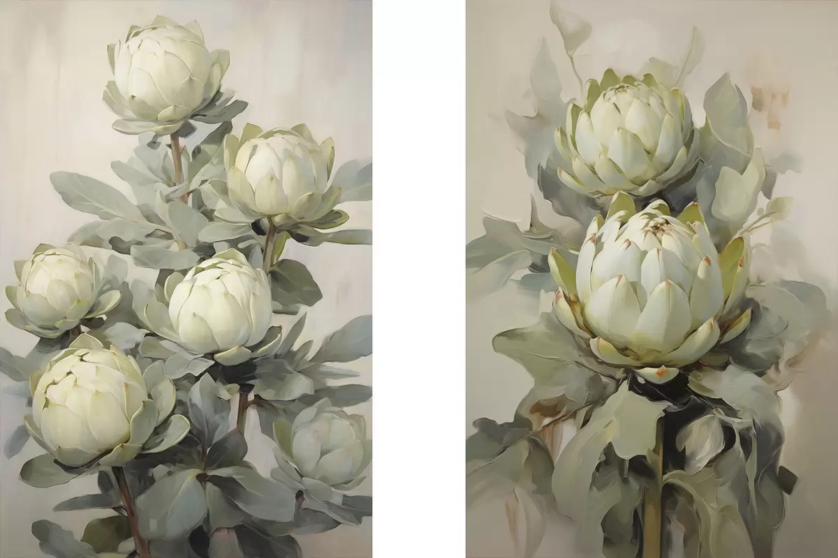 Obraz Malířský styl několika bílých květů protey s velkými zelenými listy na světlém pozadí Č. m30051
