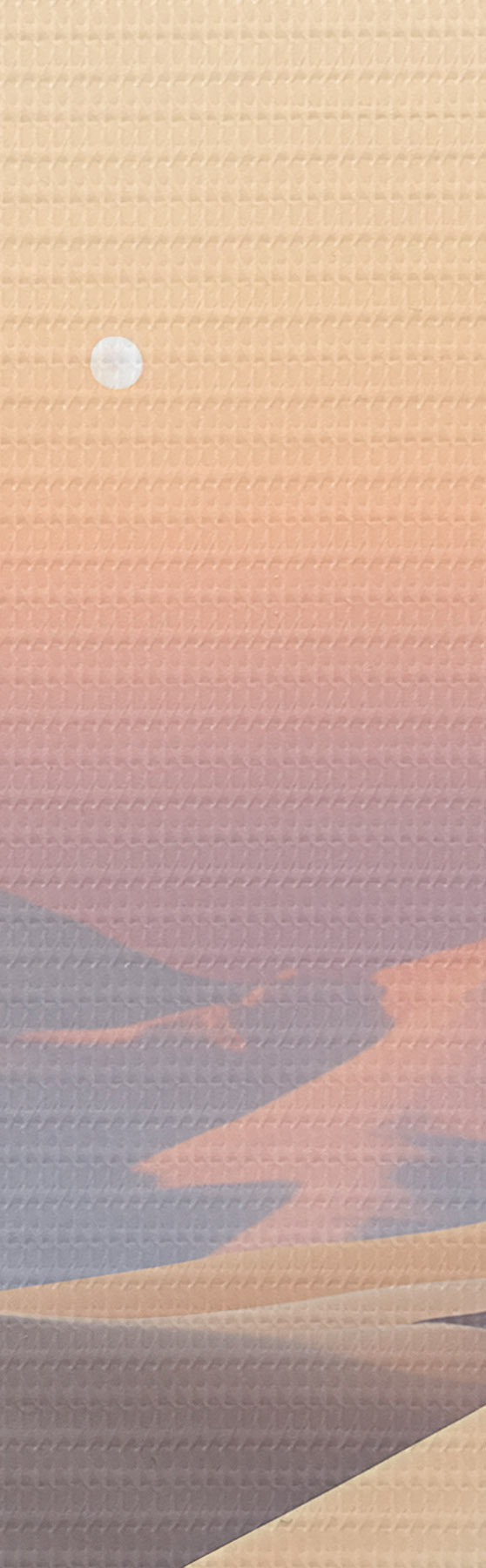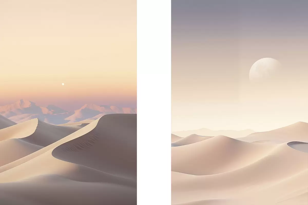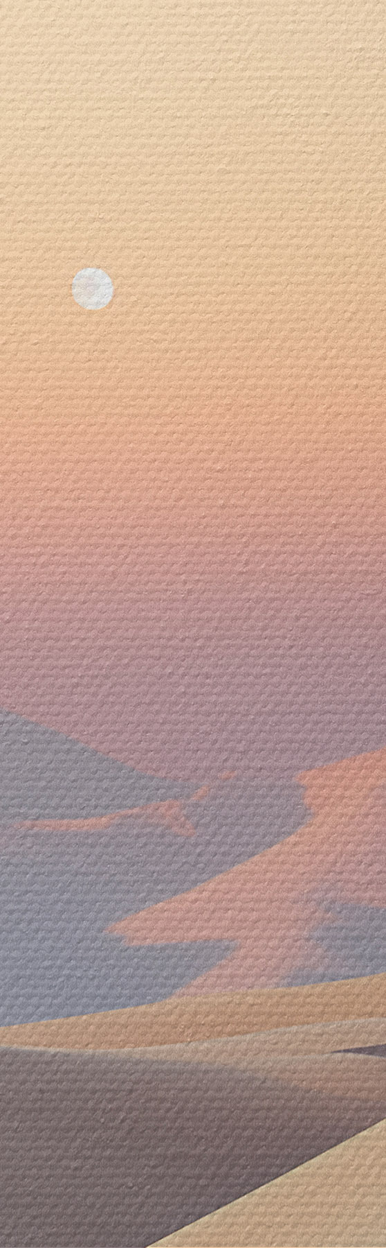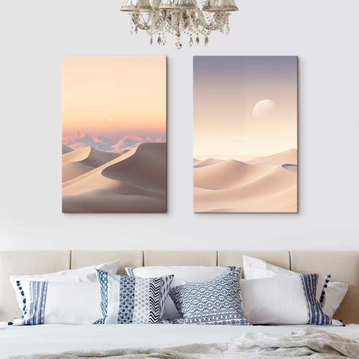 Obraz Pouštní krajina s vlnícími se písečnými dunami pod jemně pastelovou oblohou, v pozadí vzdálené hory Č. m30053