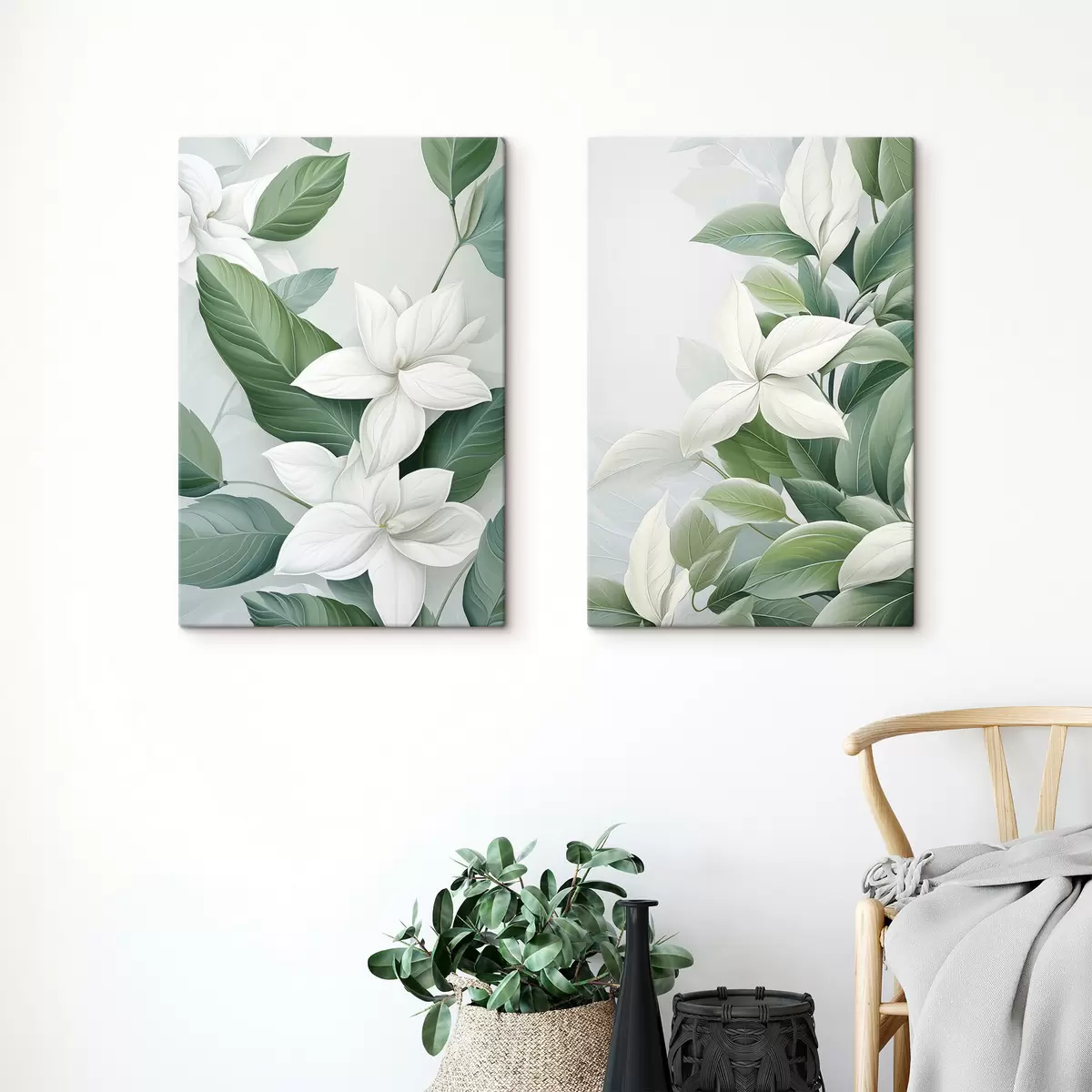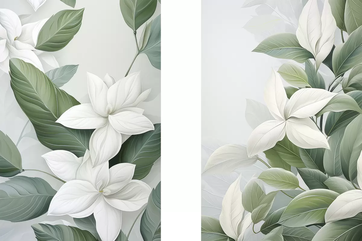 Obraz Bílé květy se zelenými listy, pastelové pozadí Č. m30055