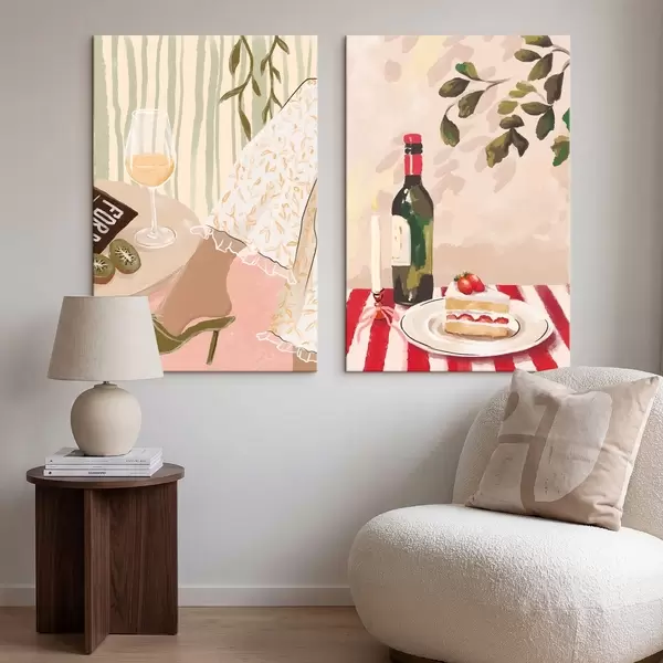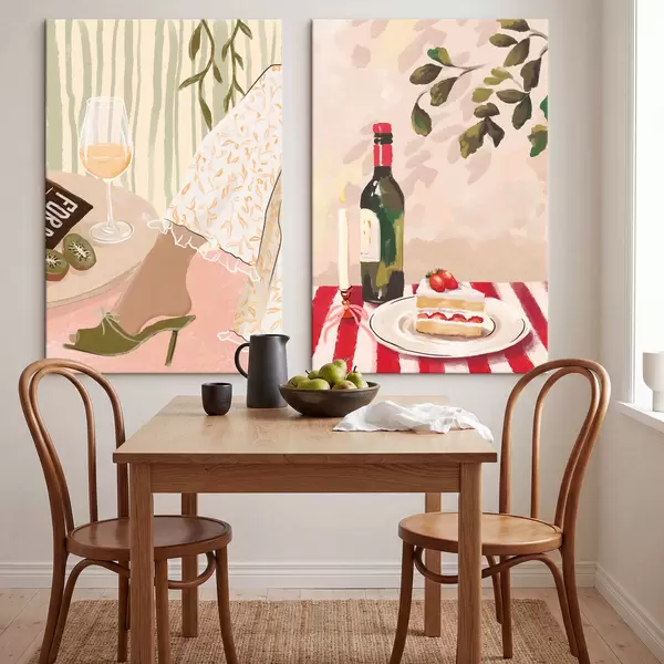 Obraz Sklenice na víno, láhev a dort na stole Č. m30105