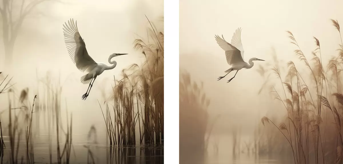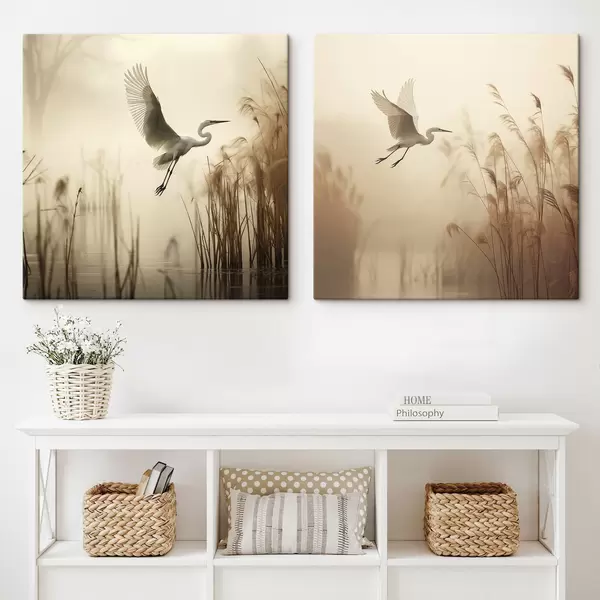 Obraz Nad jezerem, obklopeným vysokým rákosím a stromy v pozadí, letí bílá volavka Č. m30199