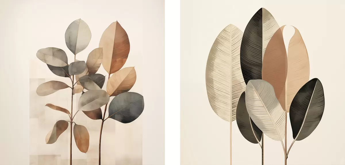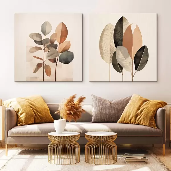 Obraz Vysoké rostliny s oválnými listy v tlumených barvách a s abstraktními obdélníkovými tvary Č. m30211