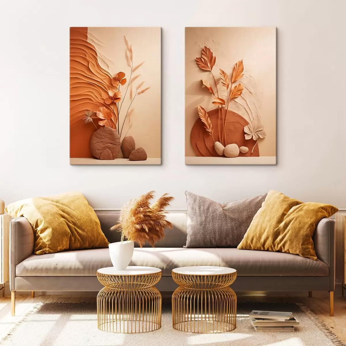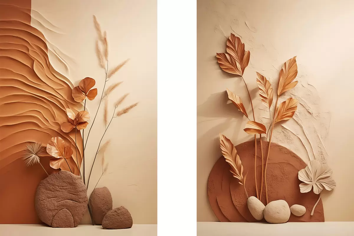 Obraz Minimalistické umělecké dílo se sušenými květinami a pampovou trávou, s texturovaným pozadím Č. m30320
