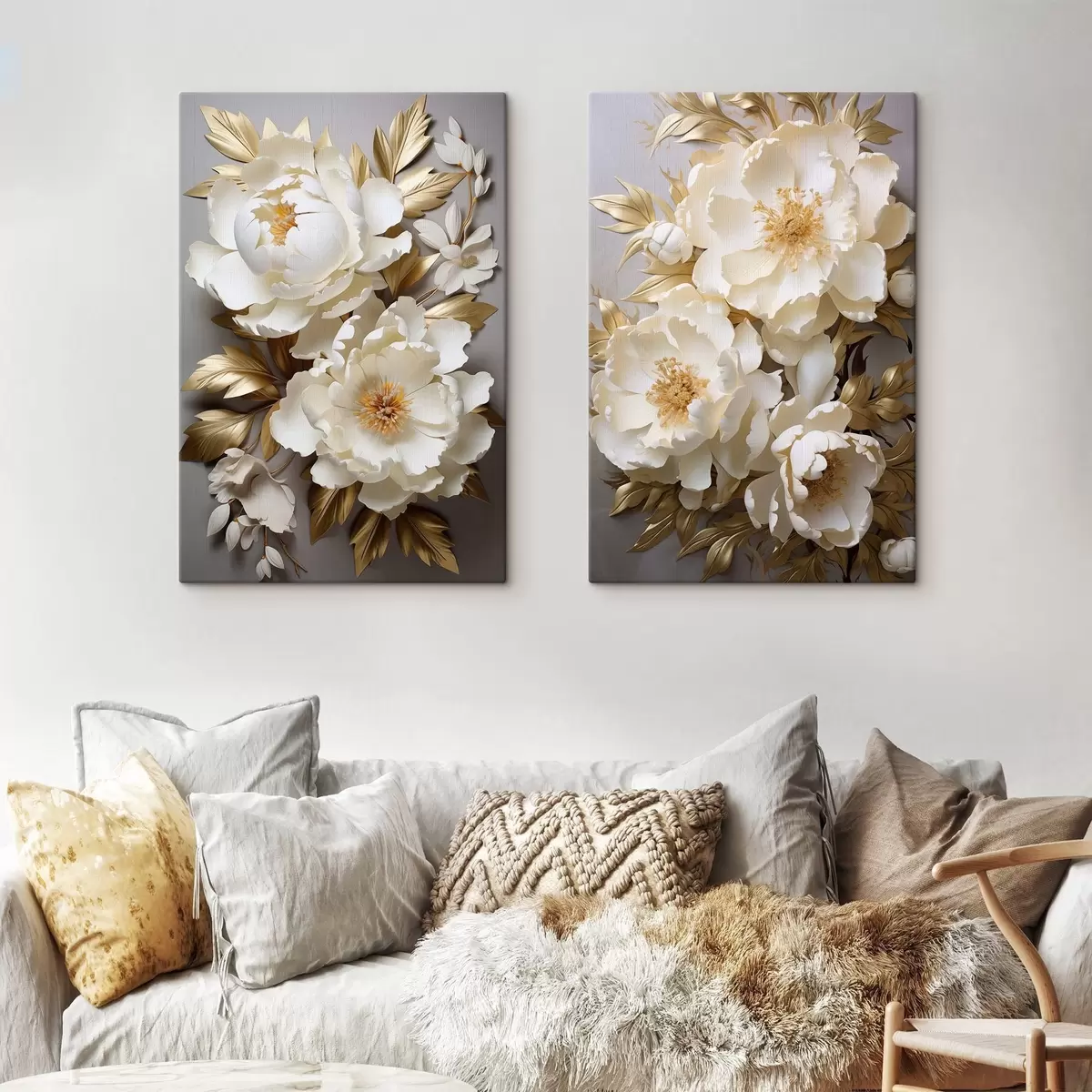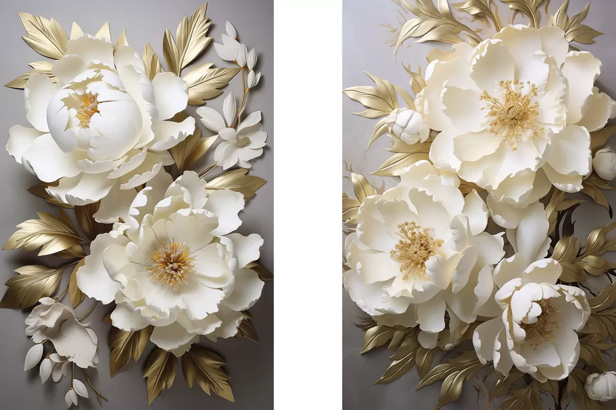 Obraz Velké bílé pivoňky se žlutými listy na šedém pozadí Č. m30327