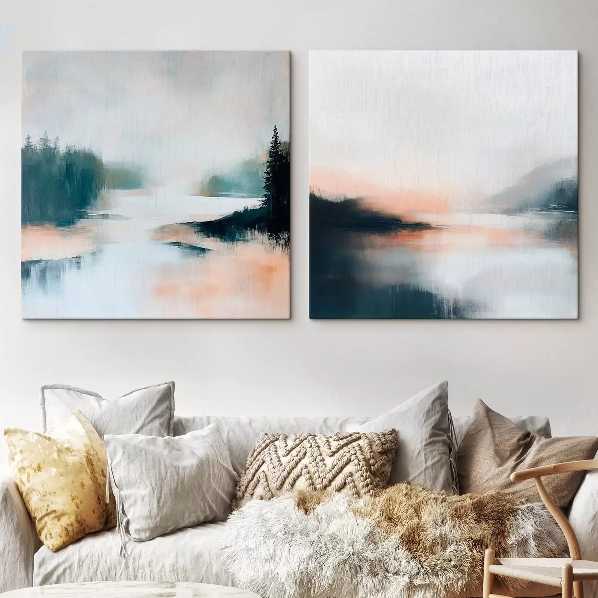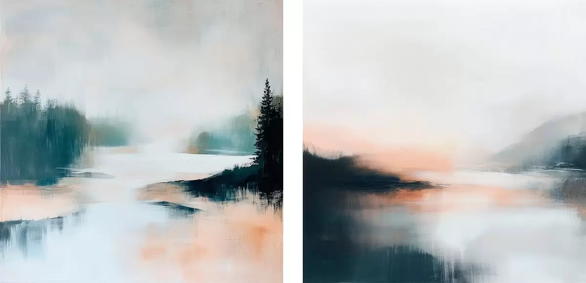 Obraz Zamlžená krajina s jehličnatými stromy a jezerem v moderním malířském stylu Č. m30357