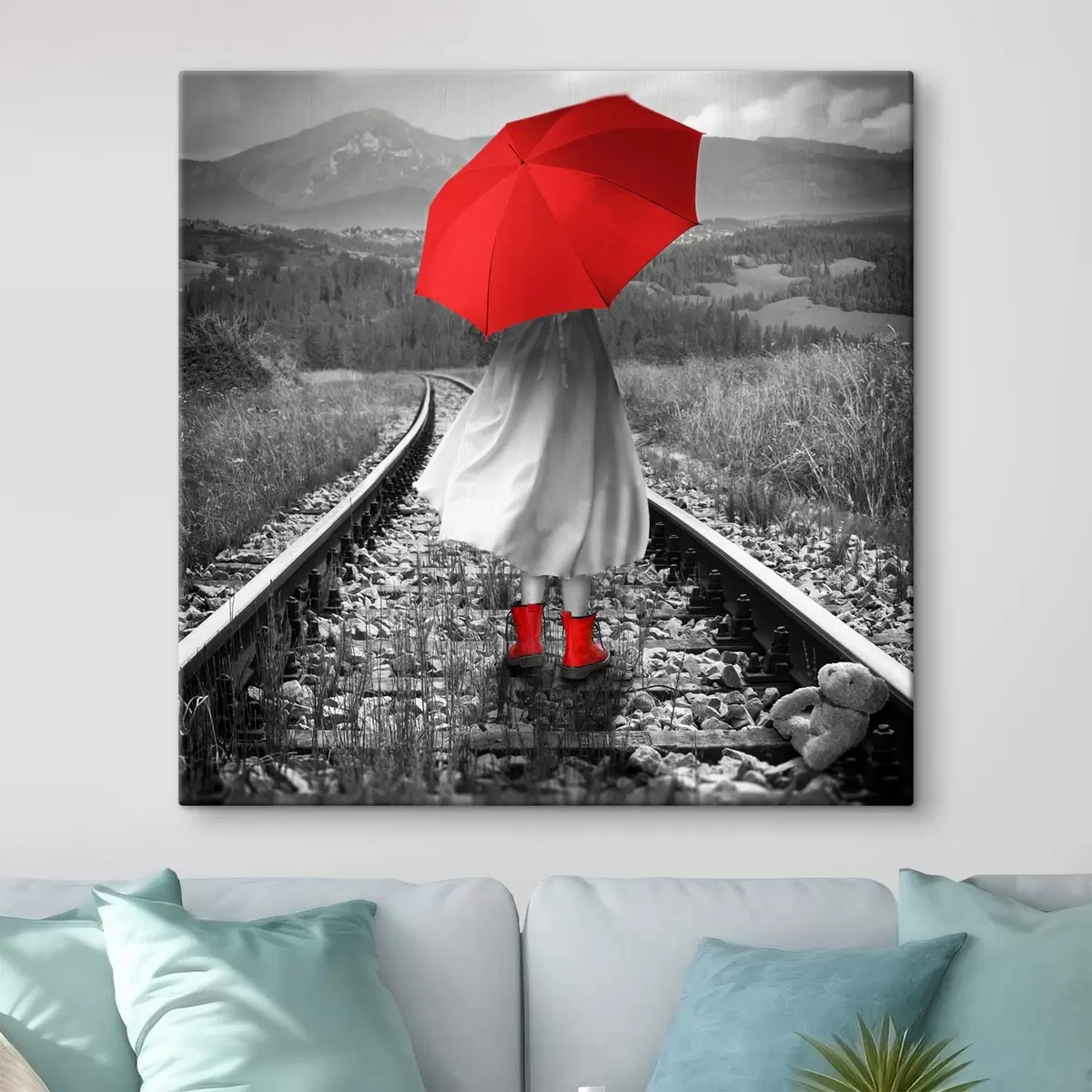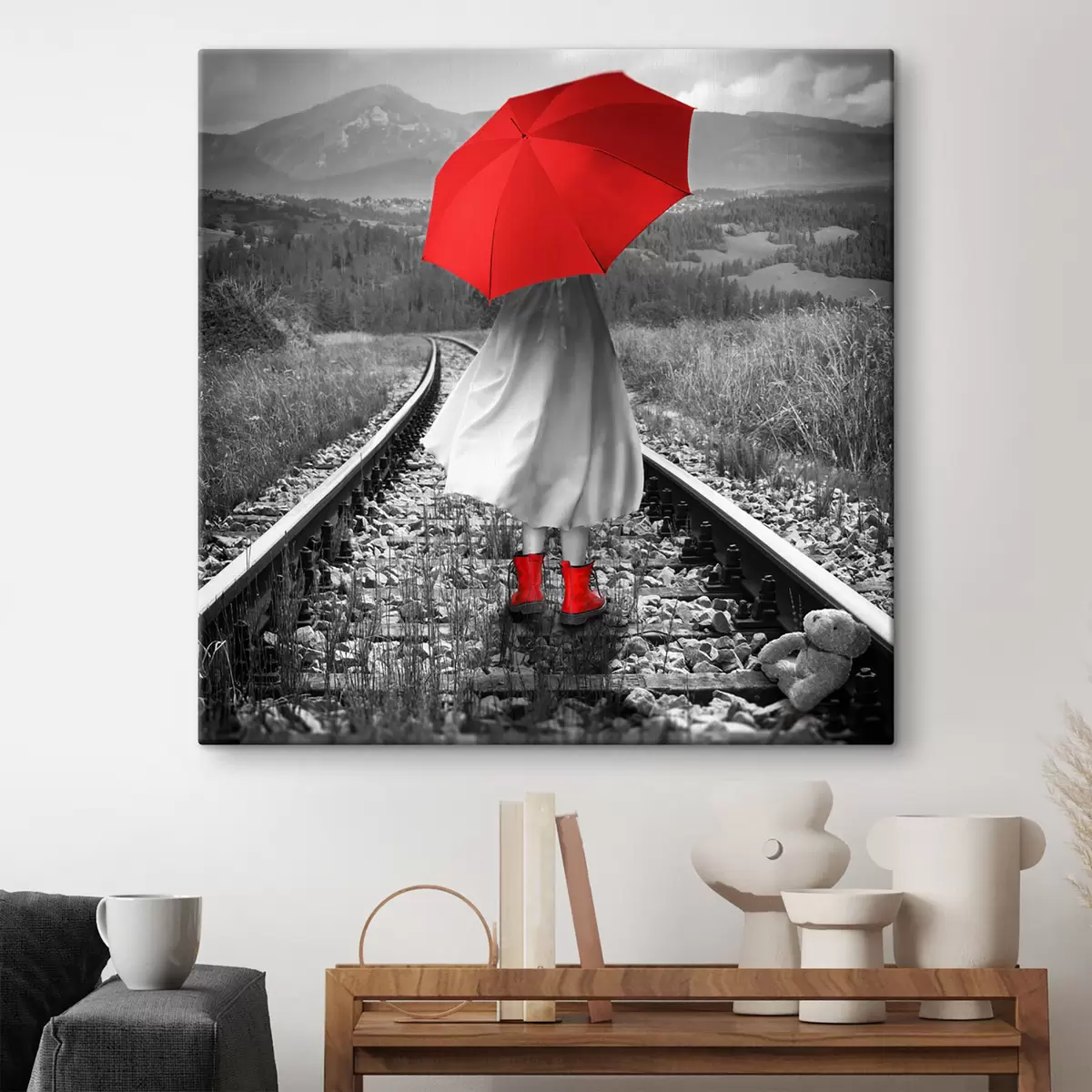 Obraz Osoba s červeným deštníkem na vlakové trati Č. s37301