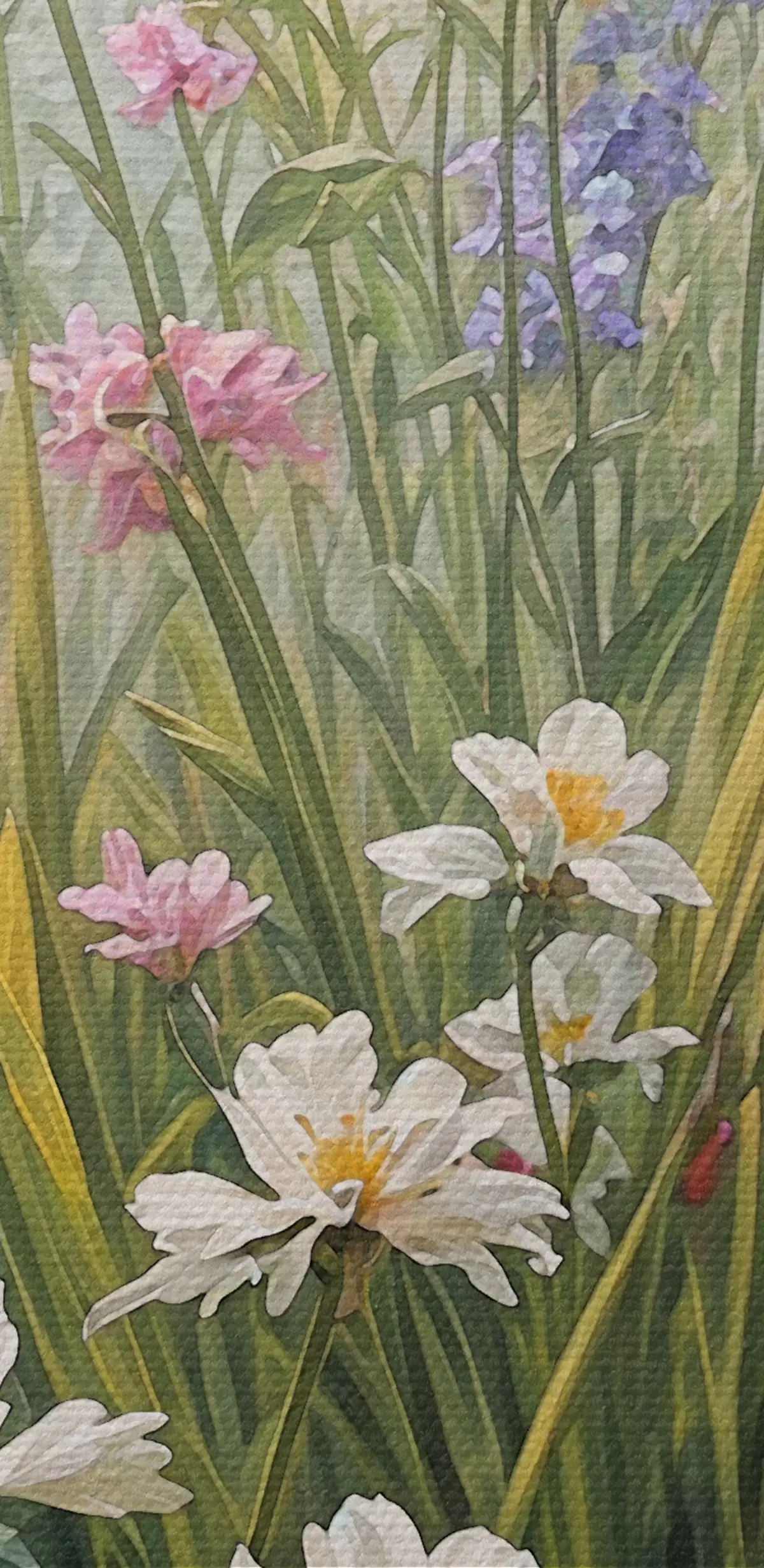 Obraz Divoké květiny a vysoké trávy. Celková scéna zobrazuje živoucí, přírodní krajinu Č. s38829