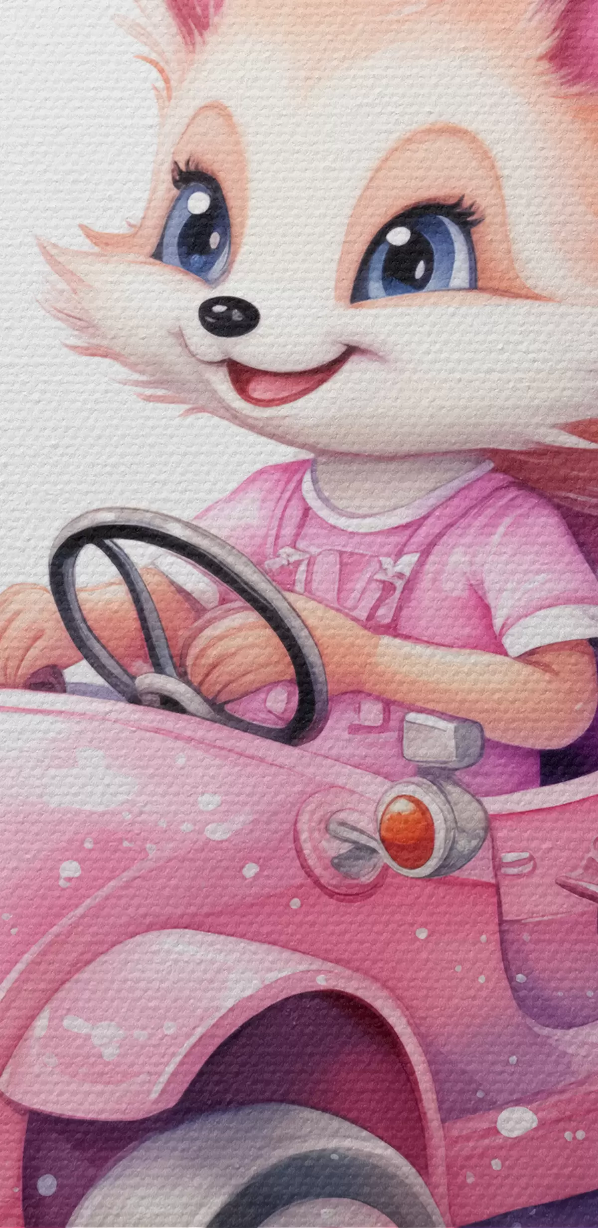 Obraz Malá liška jezdí na růžovém autě dětské akvarelové ilustrace Č. s38943