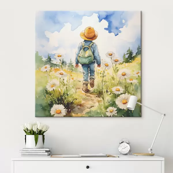 Obraz Chlapec v kovbojském klobouku se zeleným batohem za zády a modrým oblekem kráčí po cestě v poli heřmánku, akvarel Č. s38946