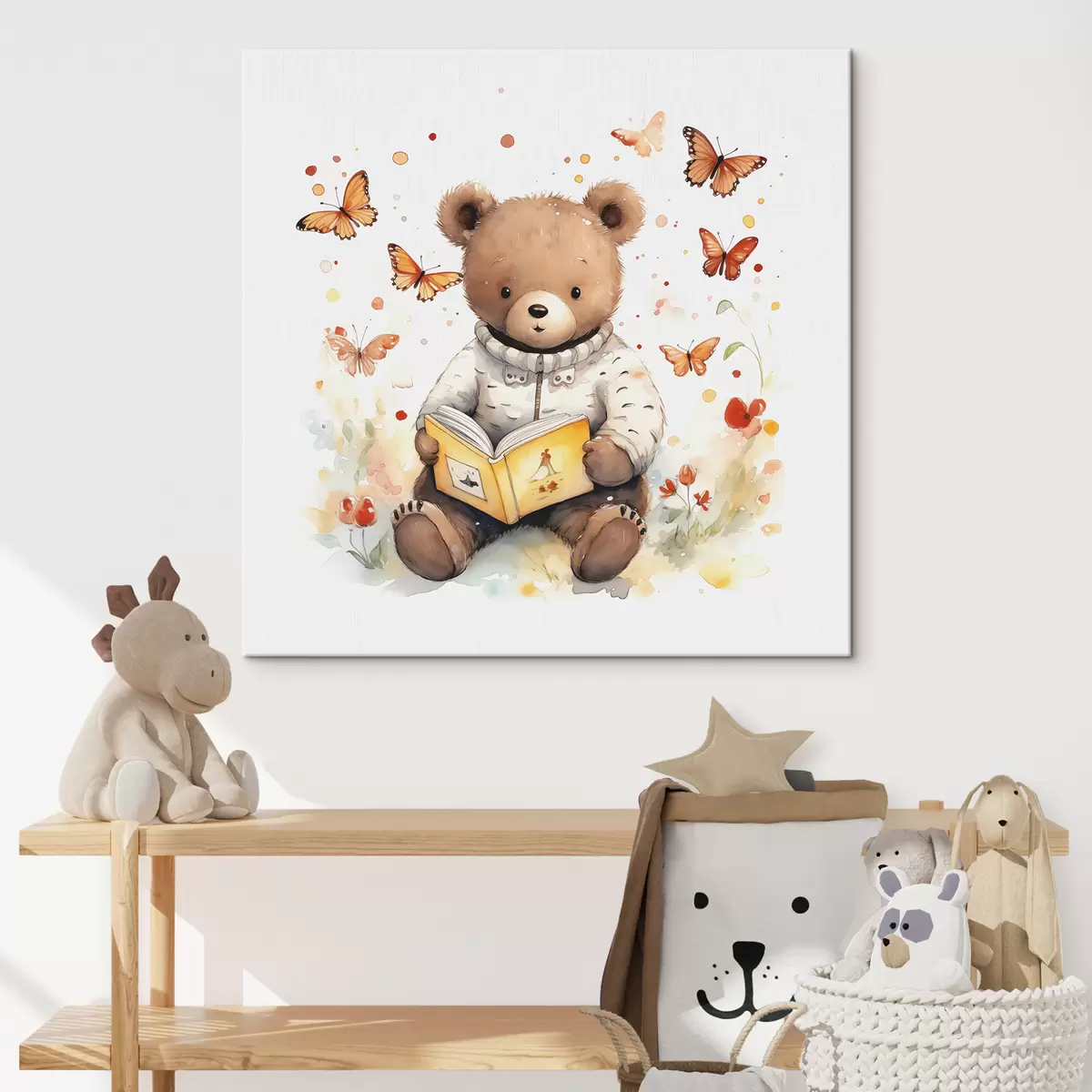 Obraz Medvěd hnědý ve svetru čte knihu obklopenou akvarelovými motýly Č. s39025