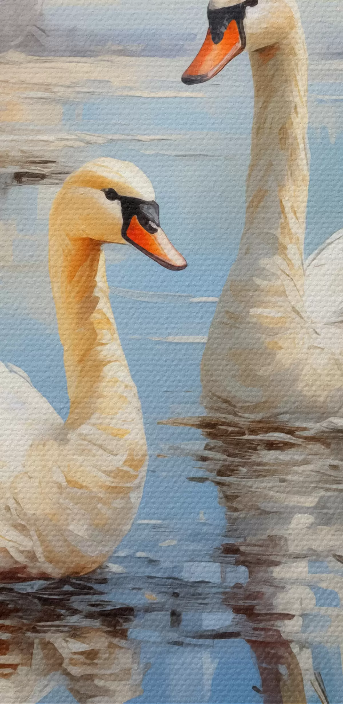 Obraz Bílé husy plavou podél řeky mezi rákosím, modrá, bílá, béžová barva Č. s39130