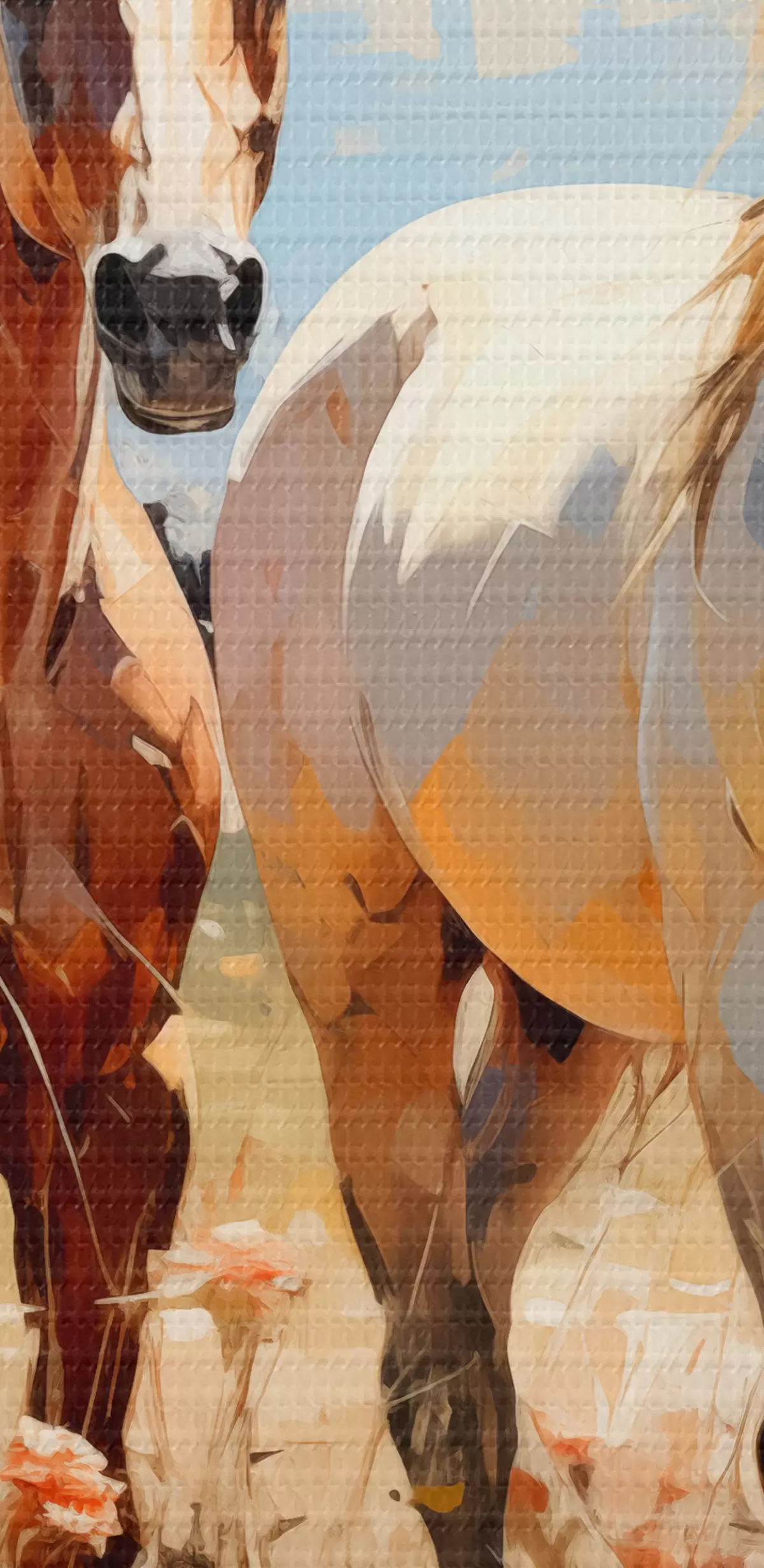 Obraz Bílí a hnědí koně se pasou na louce mezi květinami, olejomalba abstraktního umění Č. s39187