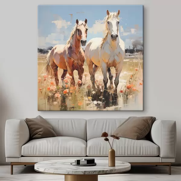 Obraz Bílí a hnědí koně se pasou na louce mezi květinami, olejomalba abstraktního umění Č. s39187