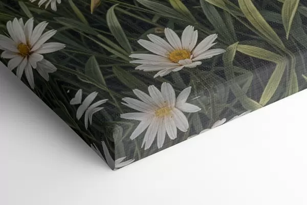 Obraz Pole bílých květů sedmikrásky v popředí s krajinou hor a zataženou oblohou Č. s39528