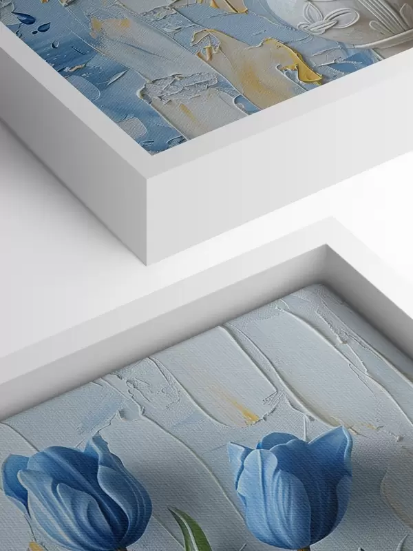 Obraz Modré a žluté tulipány ve 3D: elegantní olejomalovaný nástěnný obraz s bílým a světle modrým pozadím a rytou vázou Č. s39637