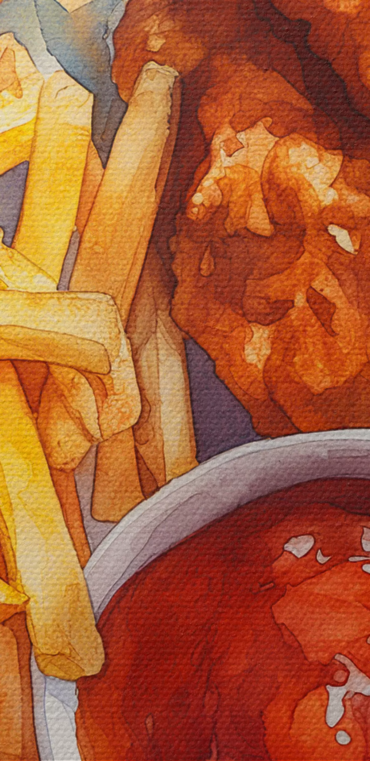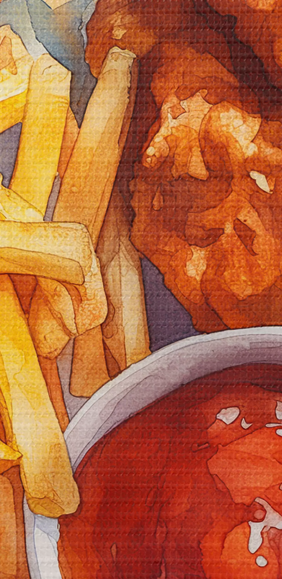 Obraz Akvarelové pouliční jídlo, hranolky s pečeným kuřecím masem, vynikající Č. s39709