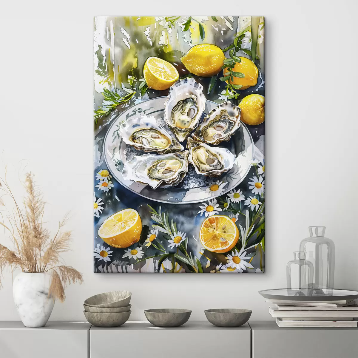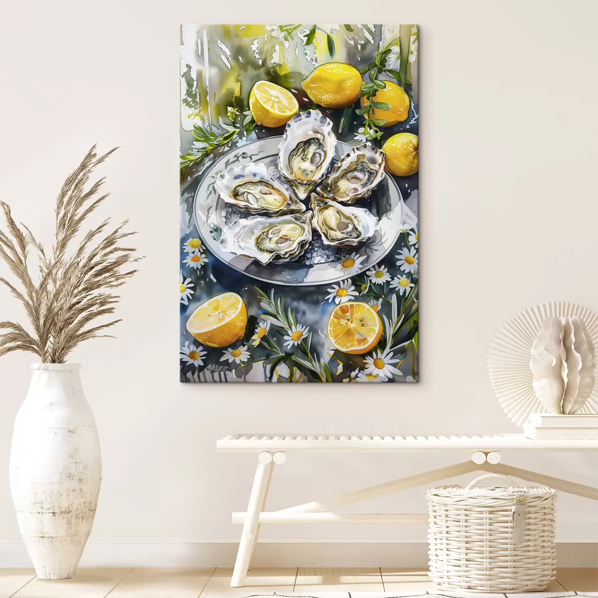 Obraz Elegantní ústřice na talíři, citrony a květiny, letní barvy, středomoří Č. s39710