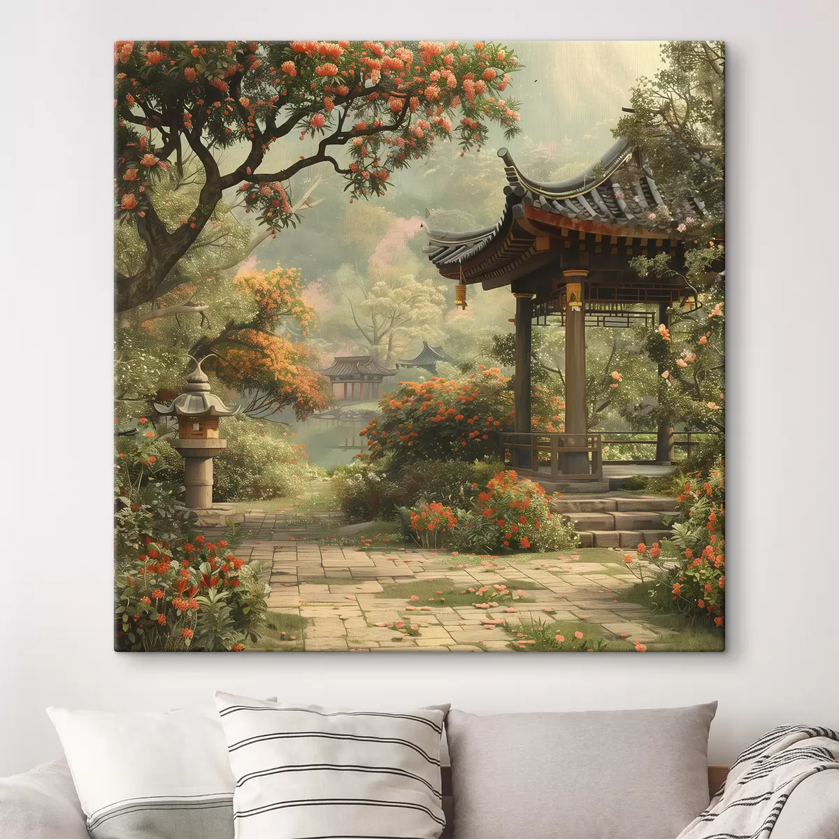 Obraz Japonský park s kvetoucími stromy a květinami, les, zahradní domek, jezero Č. s39772