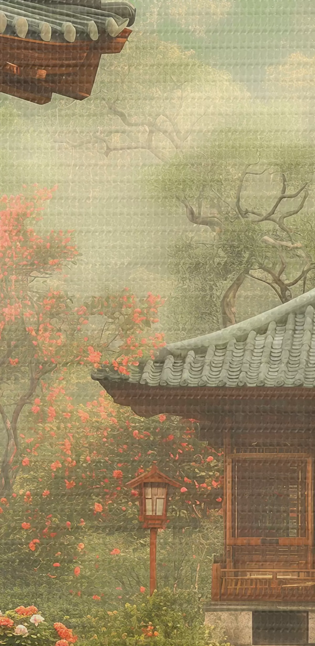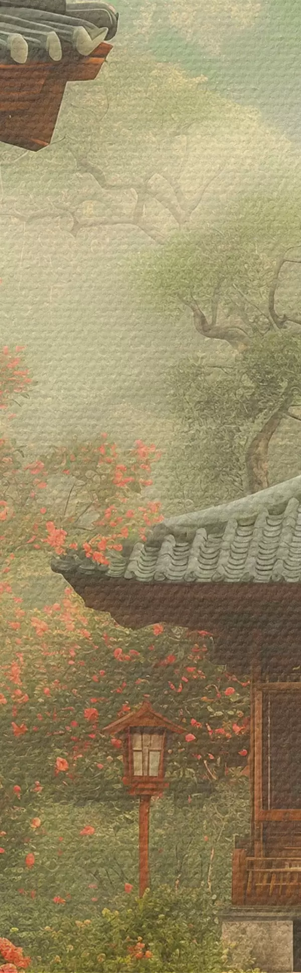 Obraz Japonský park s kvetoucími stromy a květinami, les, dřevěný dům Č. s39773